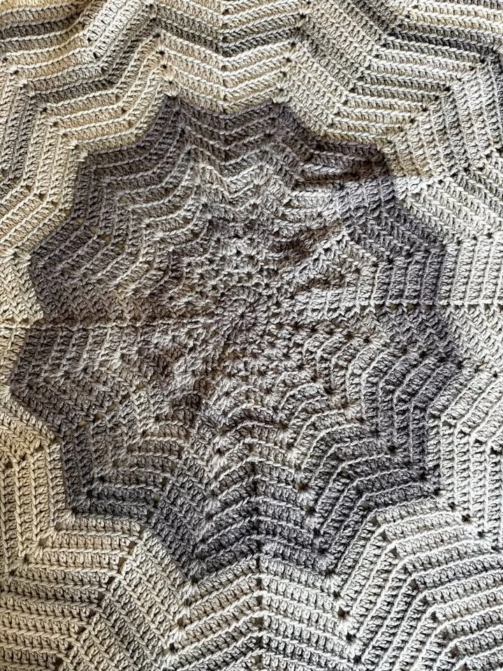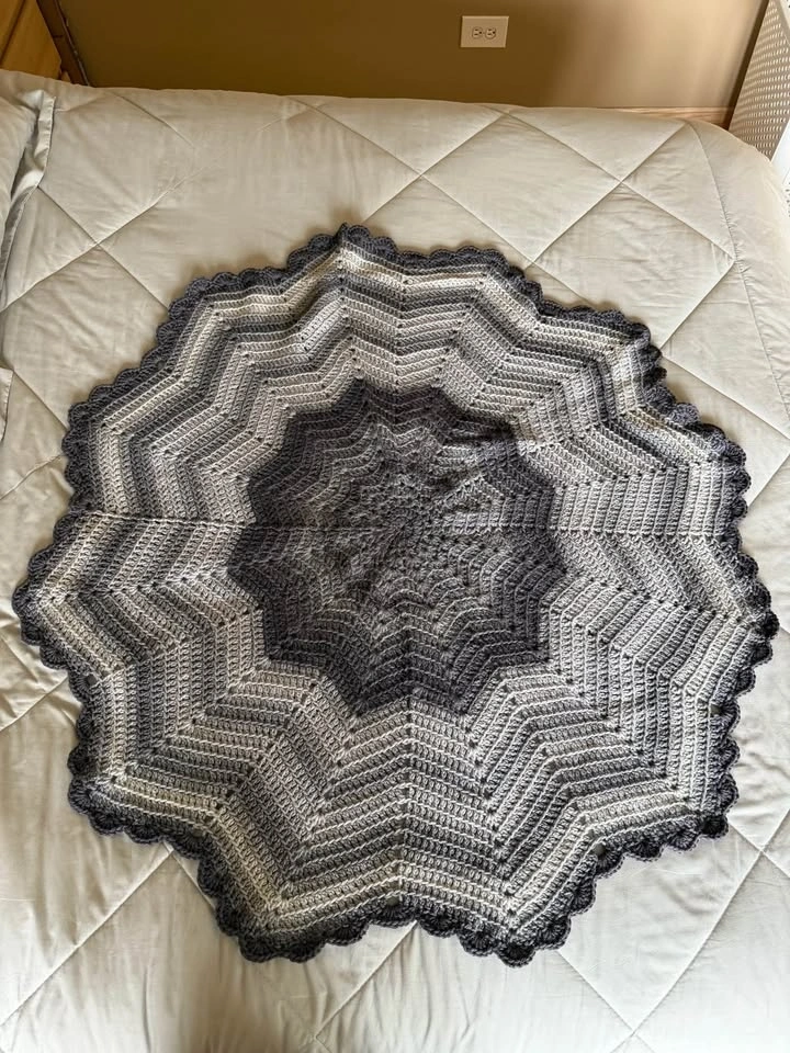 Beautiful handmade round crocheted baby blanket in blended shades of gray, taupe, charcoal, and a soft smoky mauve-gray tone with a stunning starburst-inspired design. Finished with a delicate scalloped edge, this larger blanket has a beautiful neutral look with a slightly moody, modern feel that works wonderfully for baby boys, baby girls, or gender-neutral nursery décor.