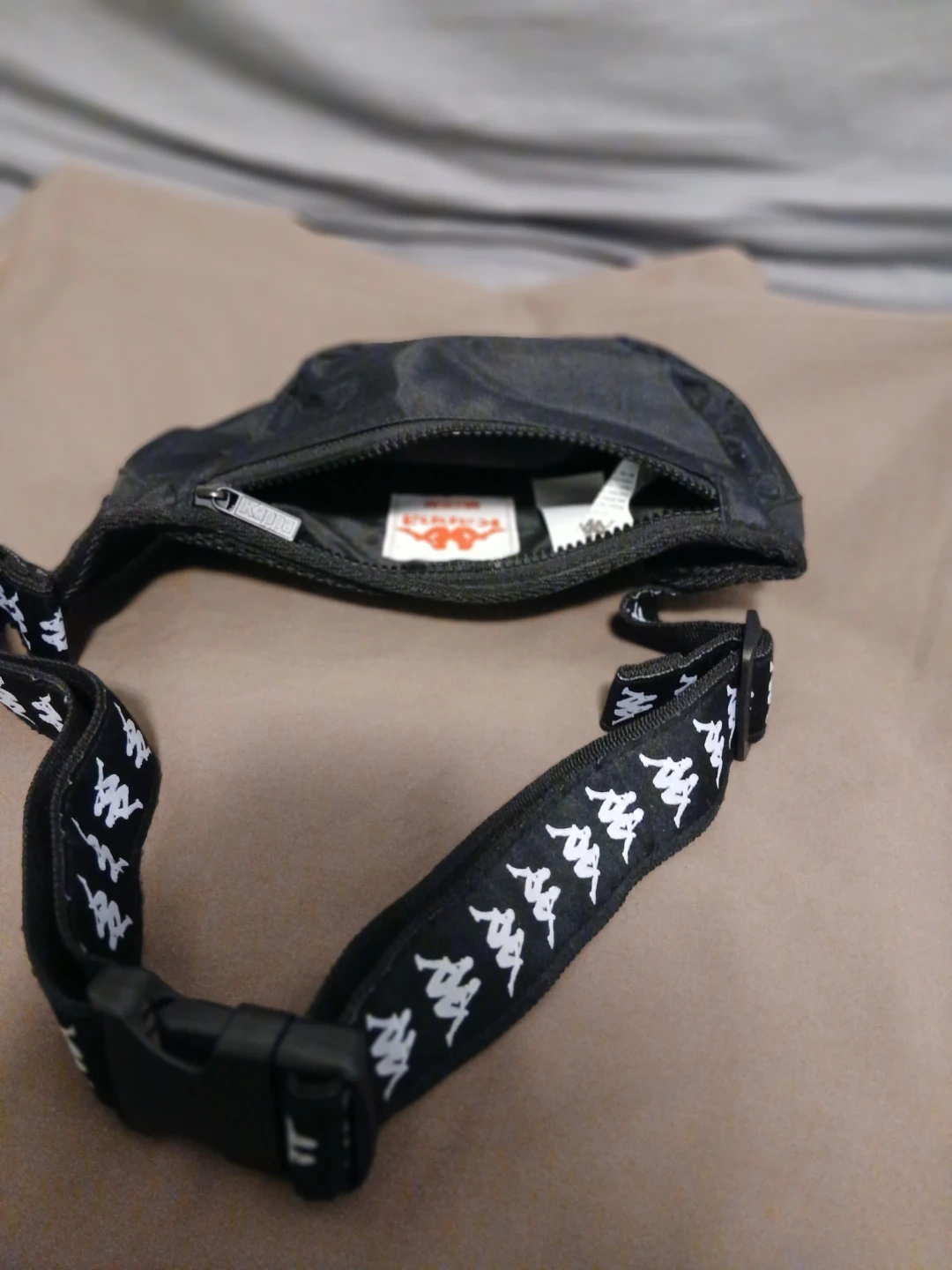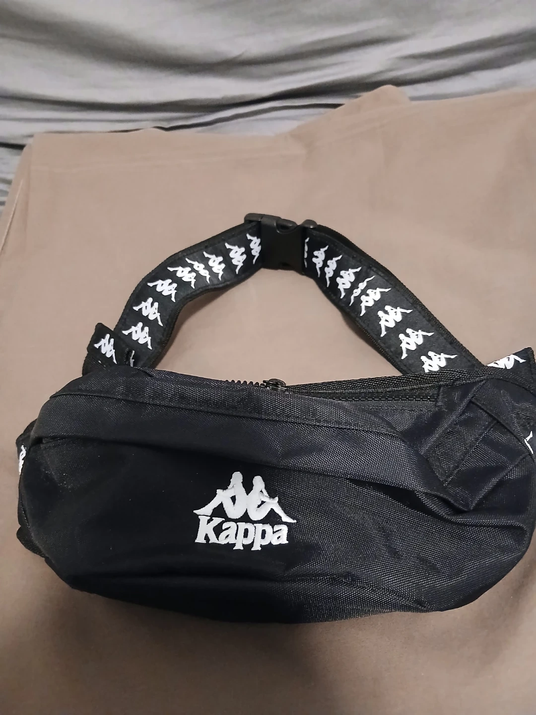 This is a black Kappa fanny pack with an adjustable strap. It features the Kappa logo printed on the strap and a larger logo on the front. This bag is made of durable nylon material. It's great for carrying essentials hands-free!