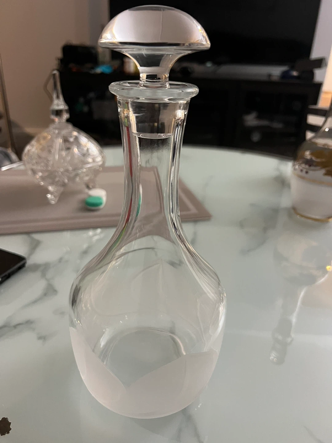 This is a clear glass decanter with a glass stopper. It has a frosted leaf design on the bottom half of the body. Glass material.