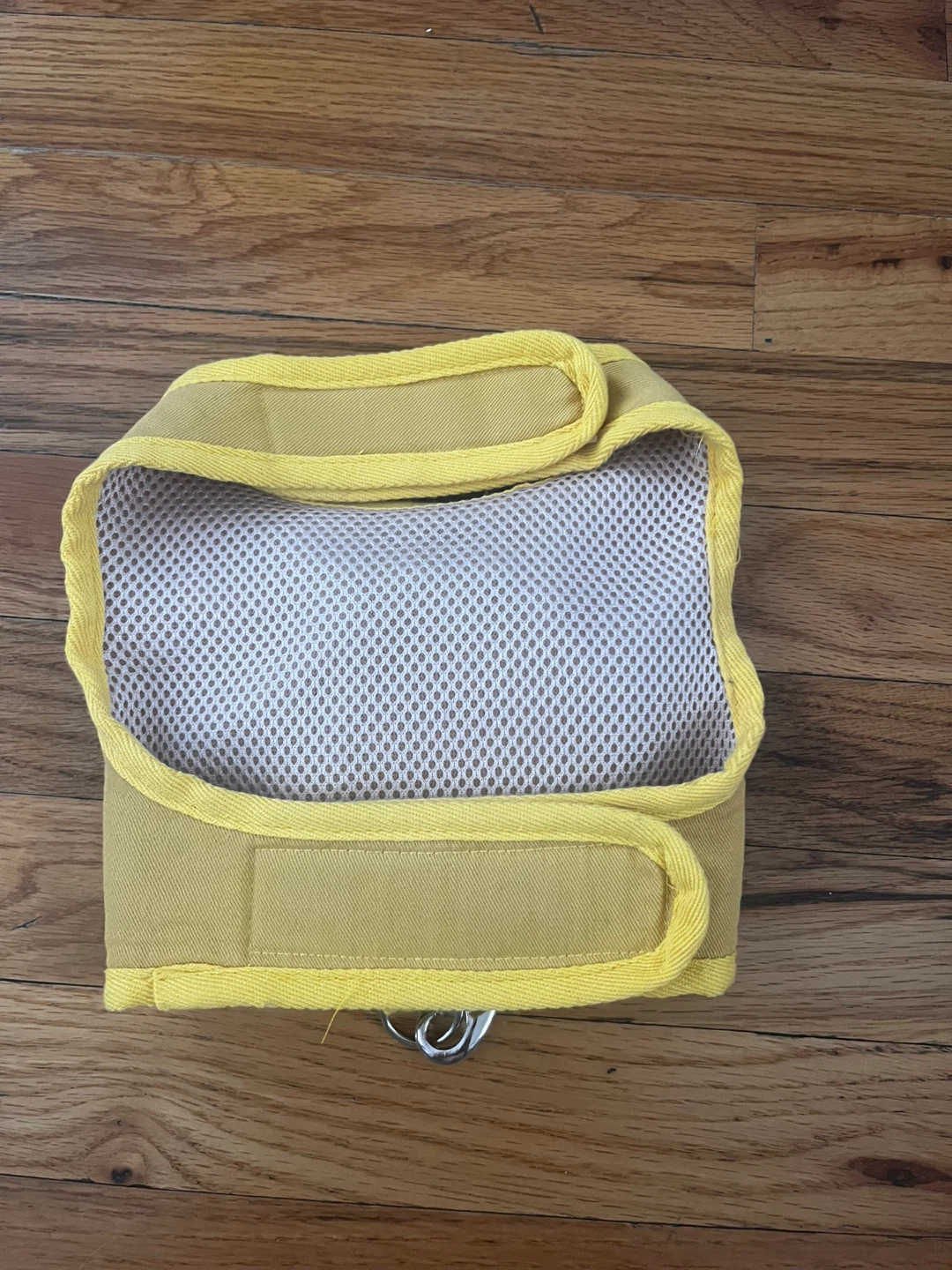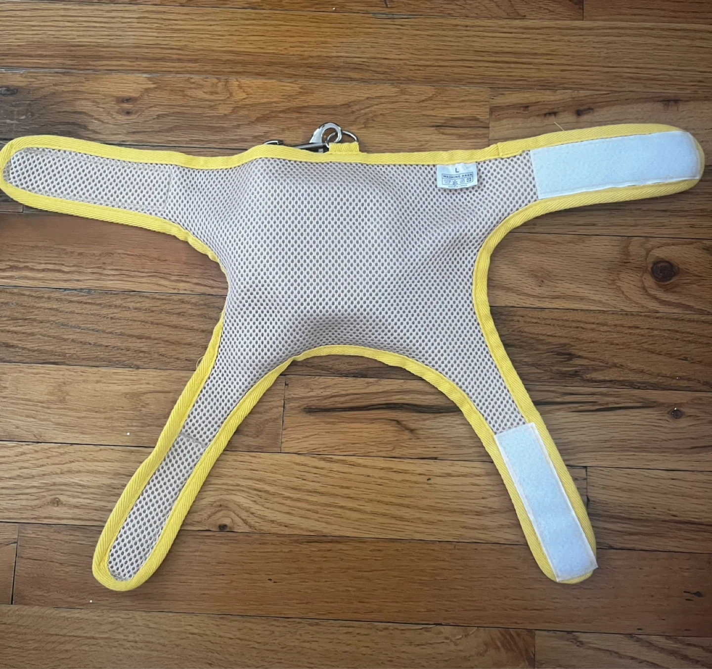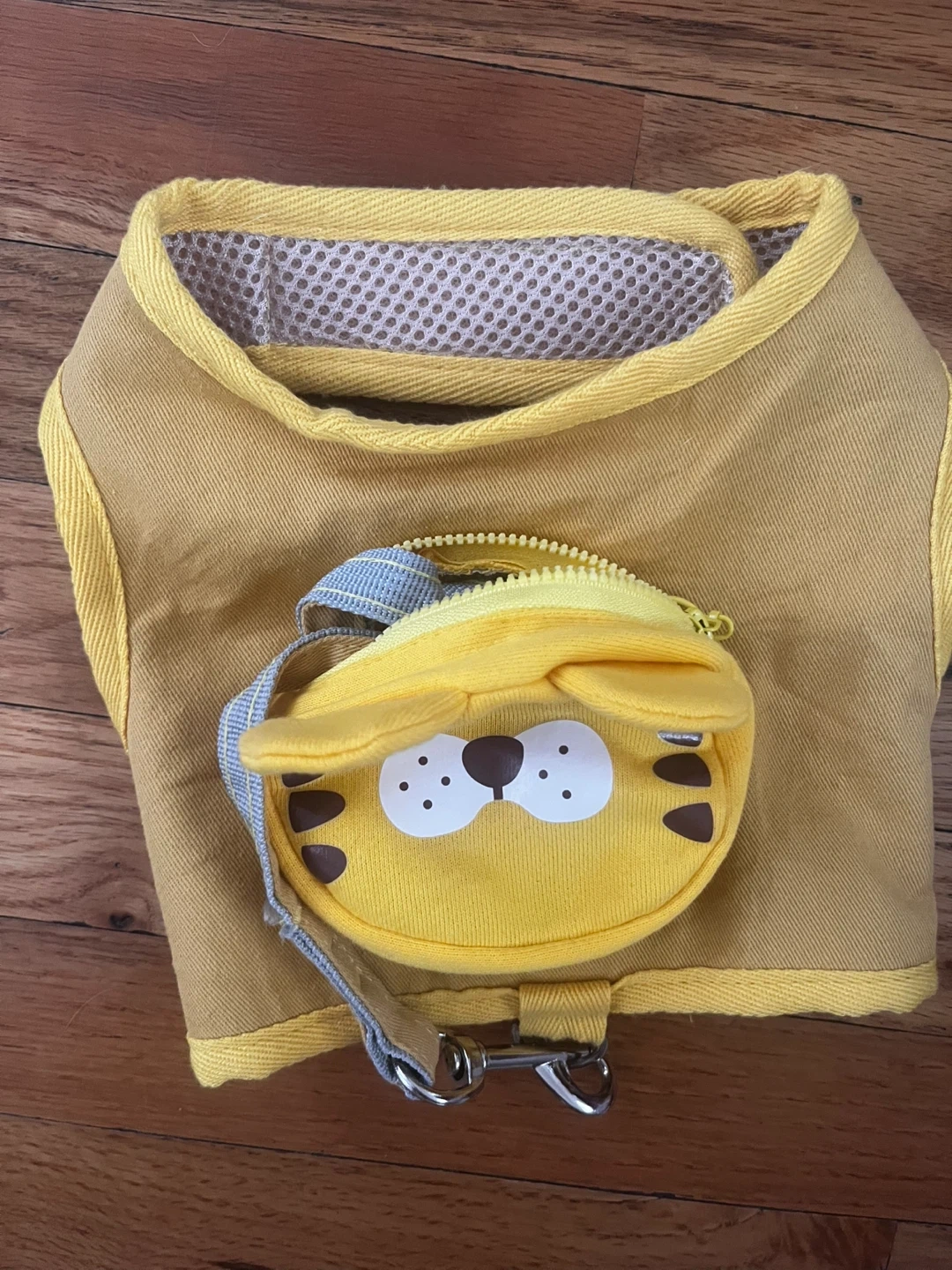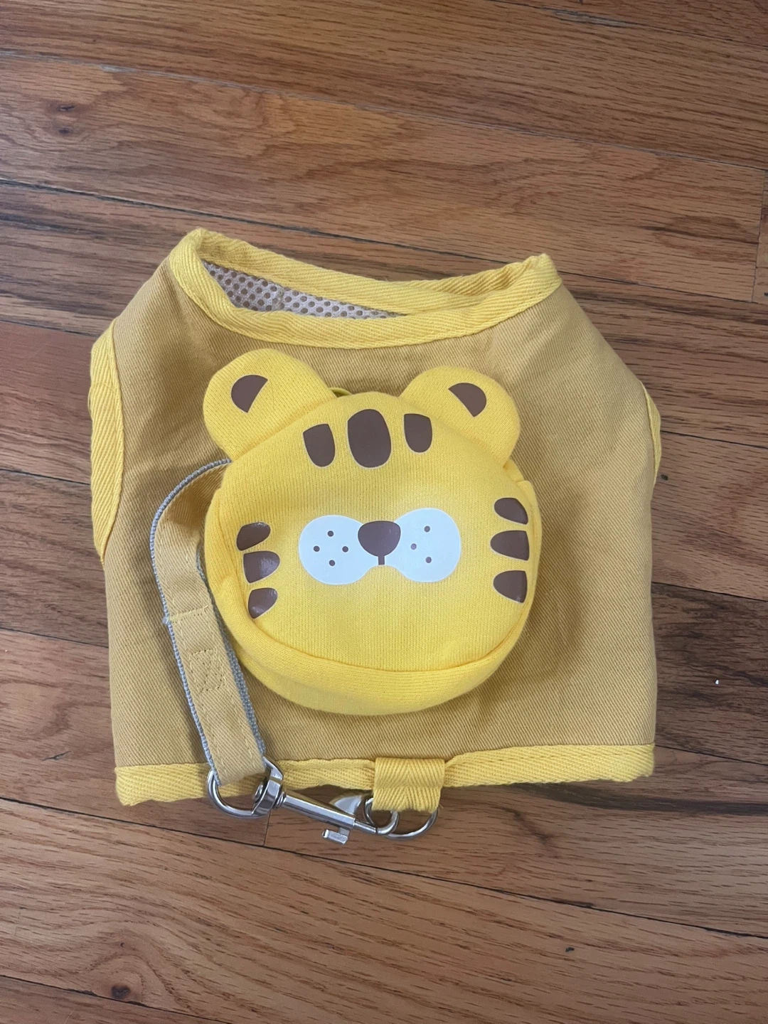 This is a yellow dog harness vest in size L. It features a cute tiger pouch on the front and adjustable velcro straps. The interior is made of breathable mesh material.