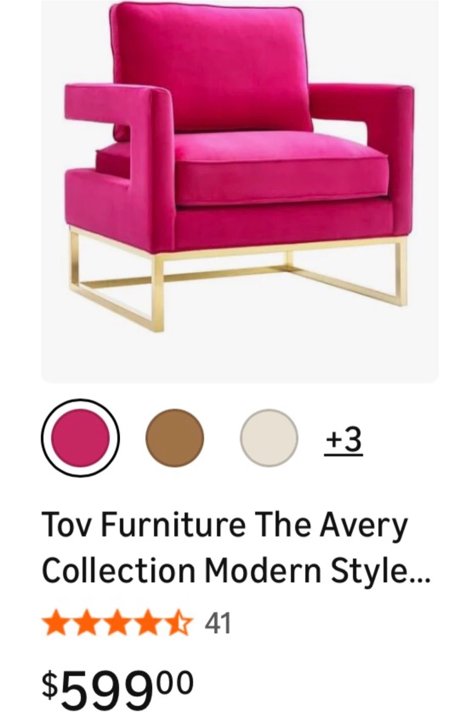 This is an Abbyson Velvet Large Armchair in Rose .It's upholstered in velvet fabric and features a gold-tone Stainless Steel metal base. Dimensions are 35.5" H x 29" W x 33.5" D. Perfect for adding a pop of color to any room!