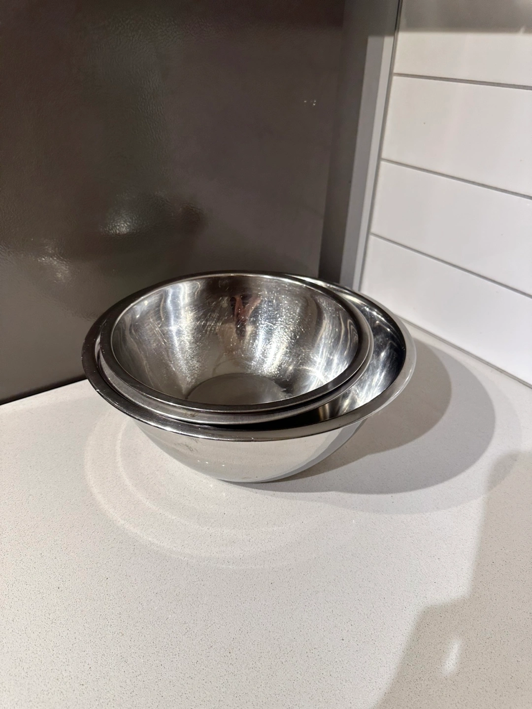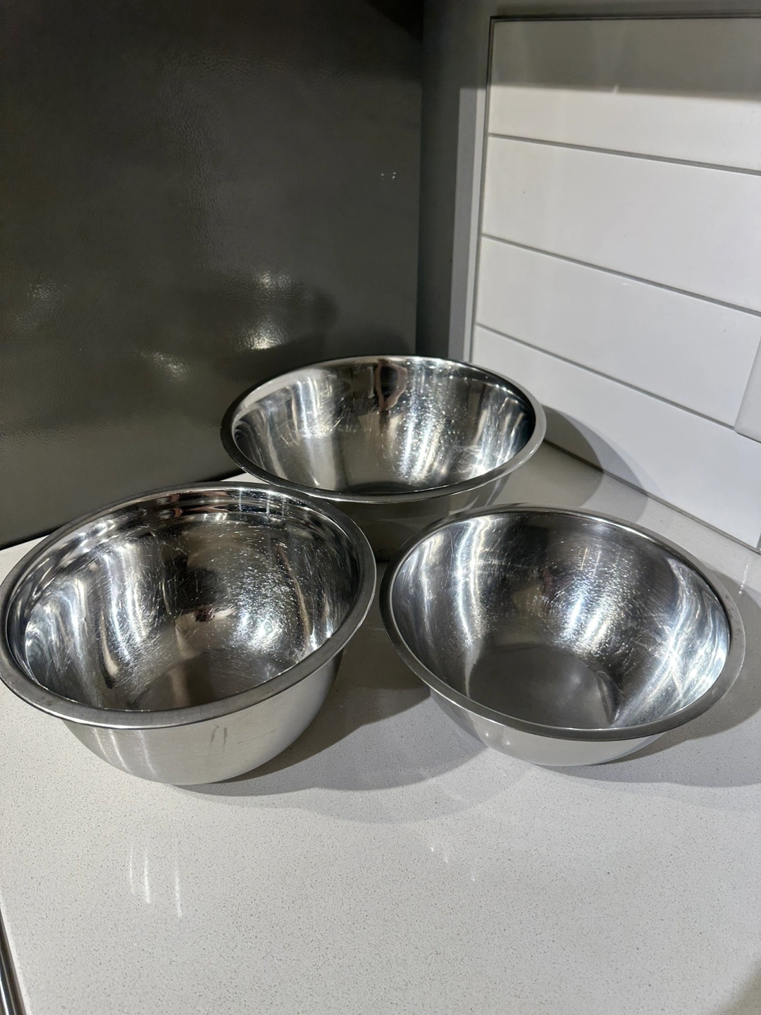 Selling a set of three stainless steel mixing bowls. They're in great shape and perfect for all your baking and cooking needs! They nest together for easy storage too
