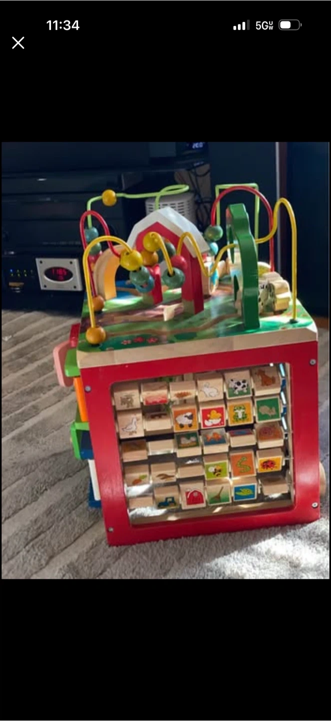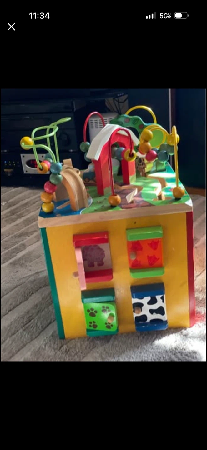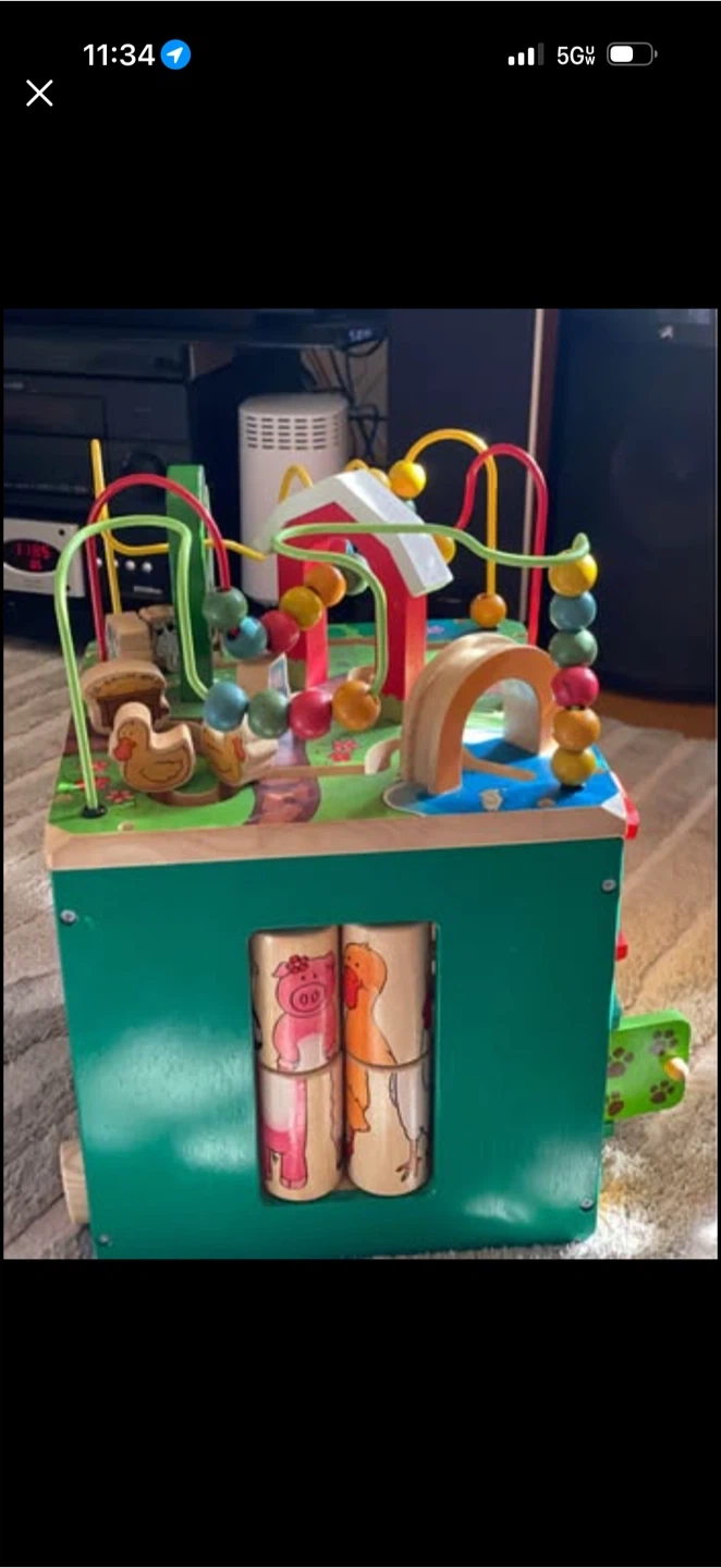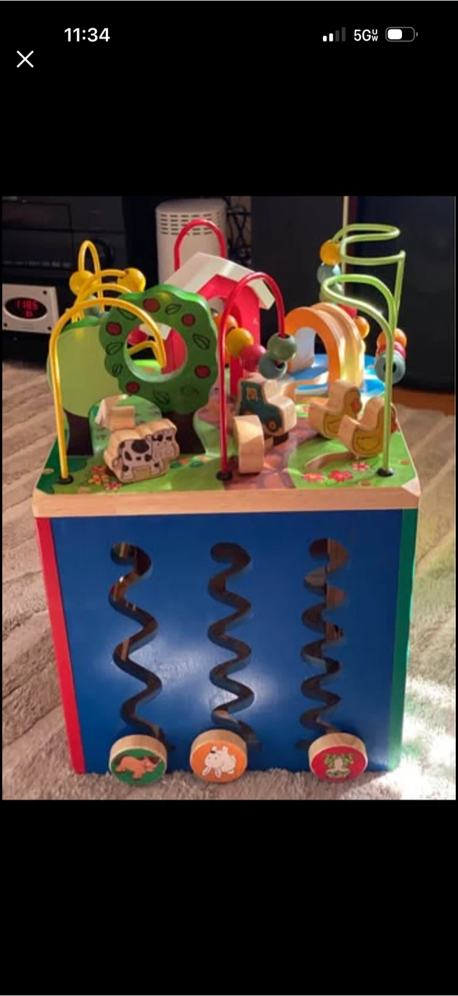 This multi-sided wooden activity cube features bead mazes, spinning gears, and interactive animal characters. It's designed to entertain and develop fine motor skills in young children. Solid wood construction ensures durability for hours of play!