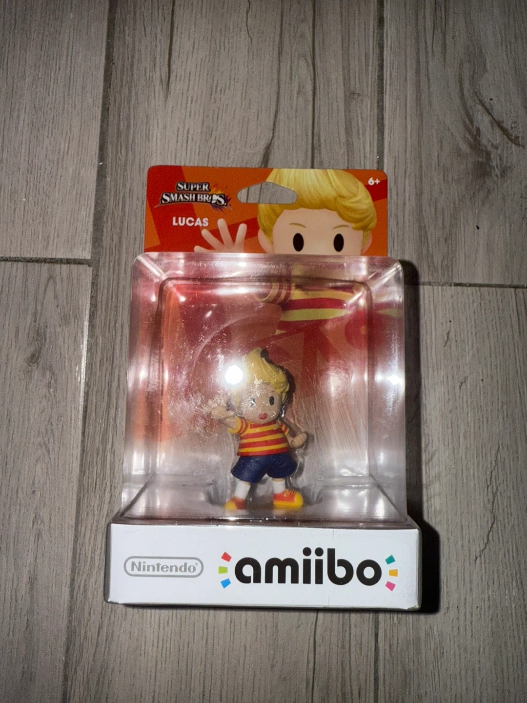 This is a Nintendo Amiibo figure of Lucas from Super Smash Bros. It's new in its original packaging. The recommended age is 6+.