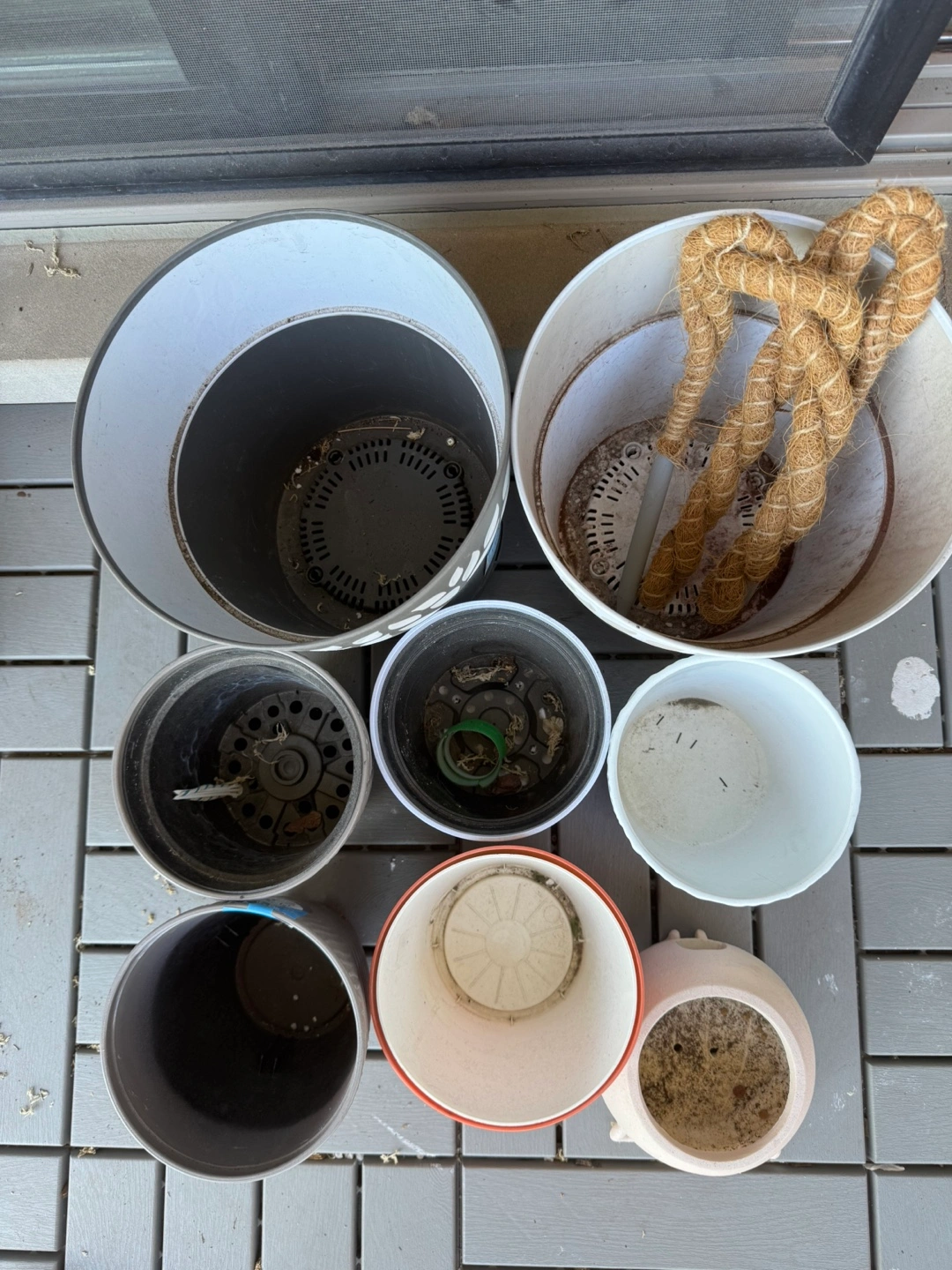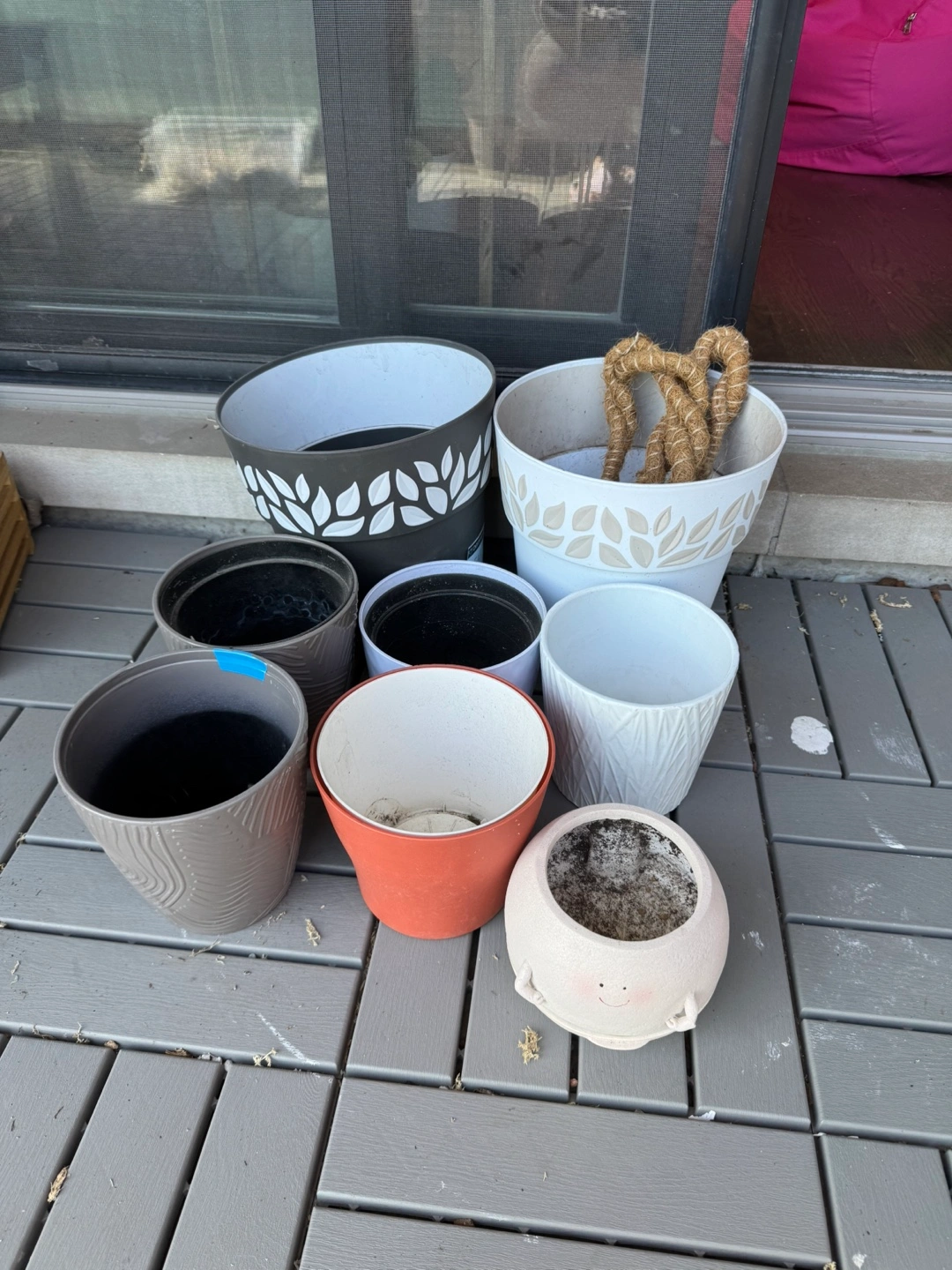 Eight plant pots, various sizes and colors. Includes plastic pots with leaf designs, textured pots, and a small ceramic pot with a face. Some pots show signs of previous use.
