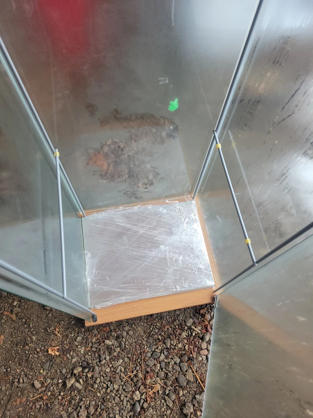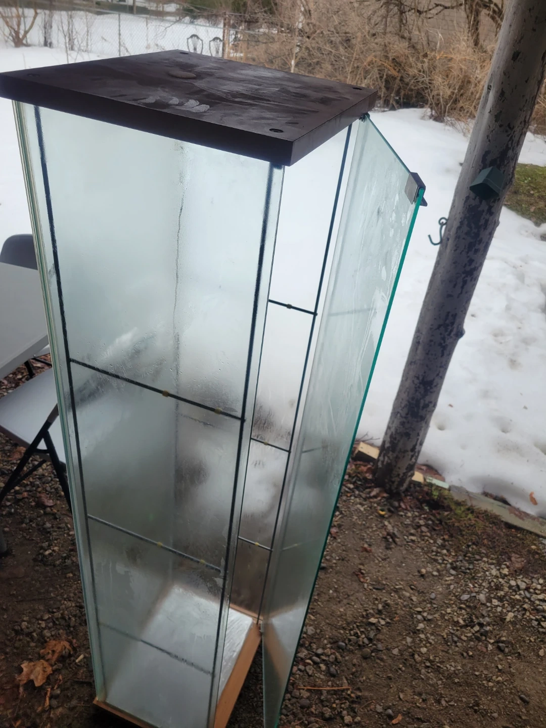 A tall glass display cabinet with wooden accents. It features multiple glass shelves for showcasing items. This cabinet would be useful for displaying collectibles or plants.