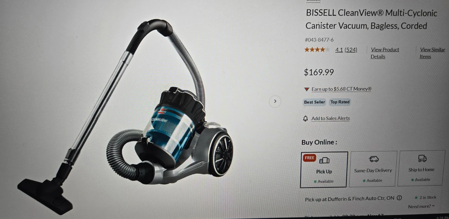 Selling a Bissell CleanView multi-cyclonic canister vacuum. It's bagless and corded for your convenience. I have it for 8 months and only have been used 3 times. Retails for $169.99+Tax.