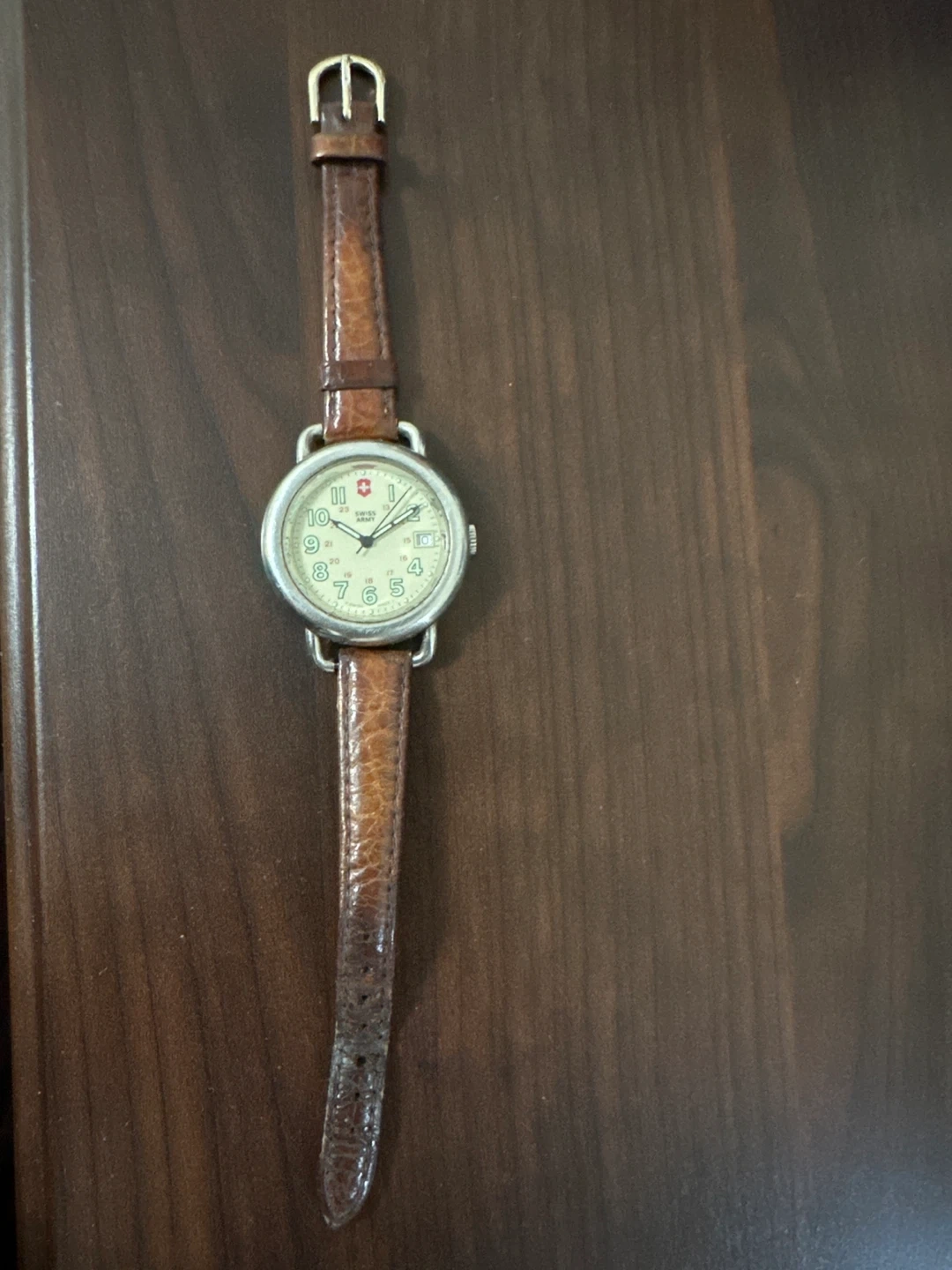 This is a Swiss Army watch with a cream-colored face and a brown leather strap. It features Arabic numerals and a date window. The watch has a classic design suitable for everyday wear.