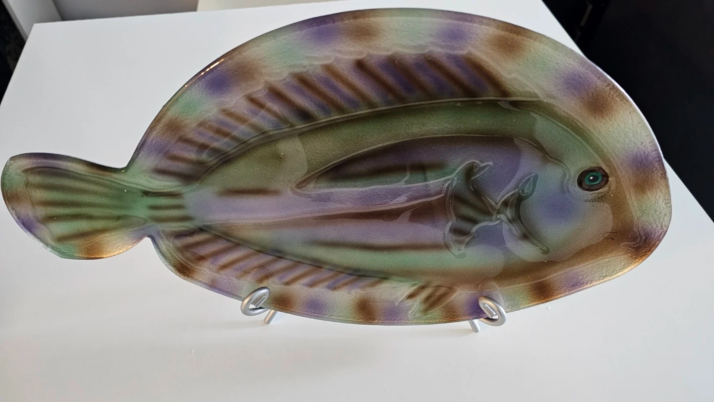 Unique fish-shaped glass plate in lovely shades of green, purple, and brown. It's in great condition and would make a charming addition to any home!