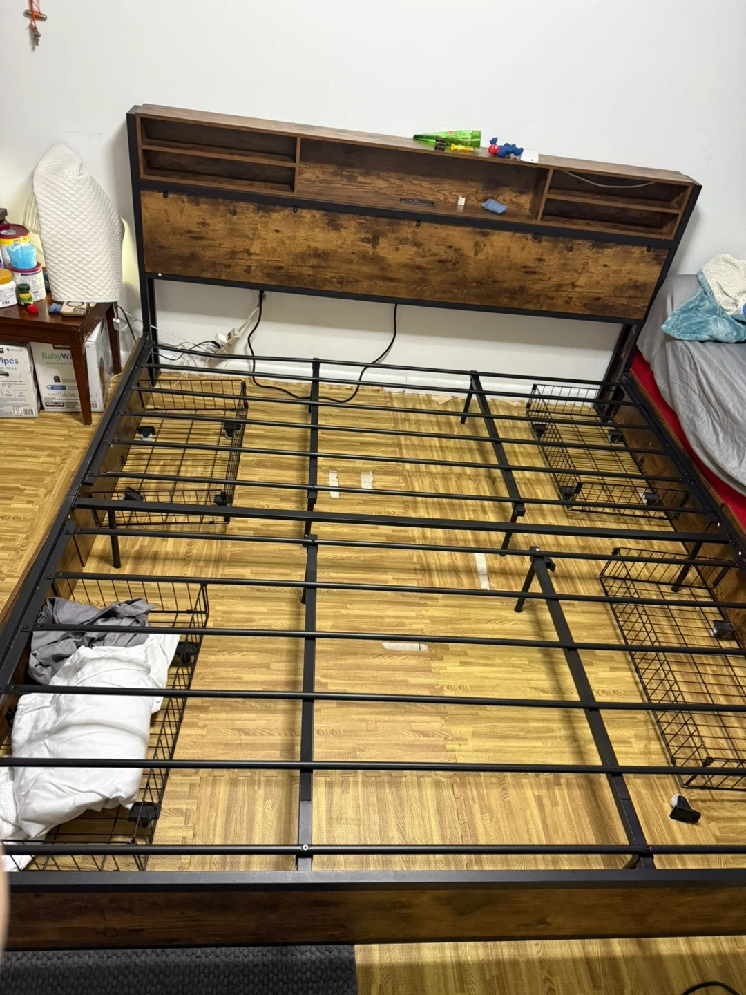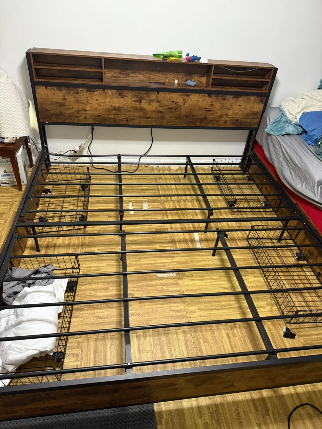This king size bed frame has a rustic wood headboard with built-in shelves. It's constructed with a durable metal frame and includes under-bed storage baskets. This bed frame is designed to support a mattress without a box spring. It's a sturdy option for organizing your bedroom!