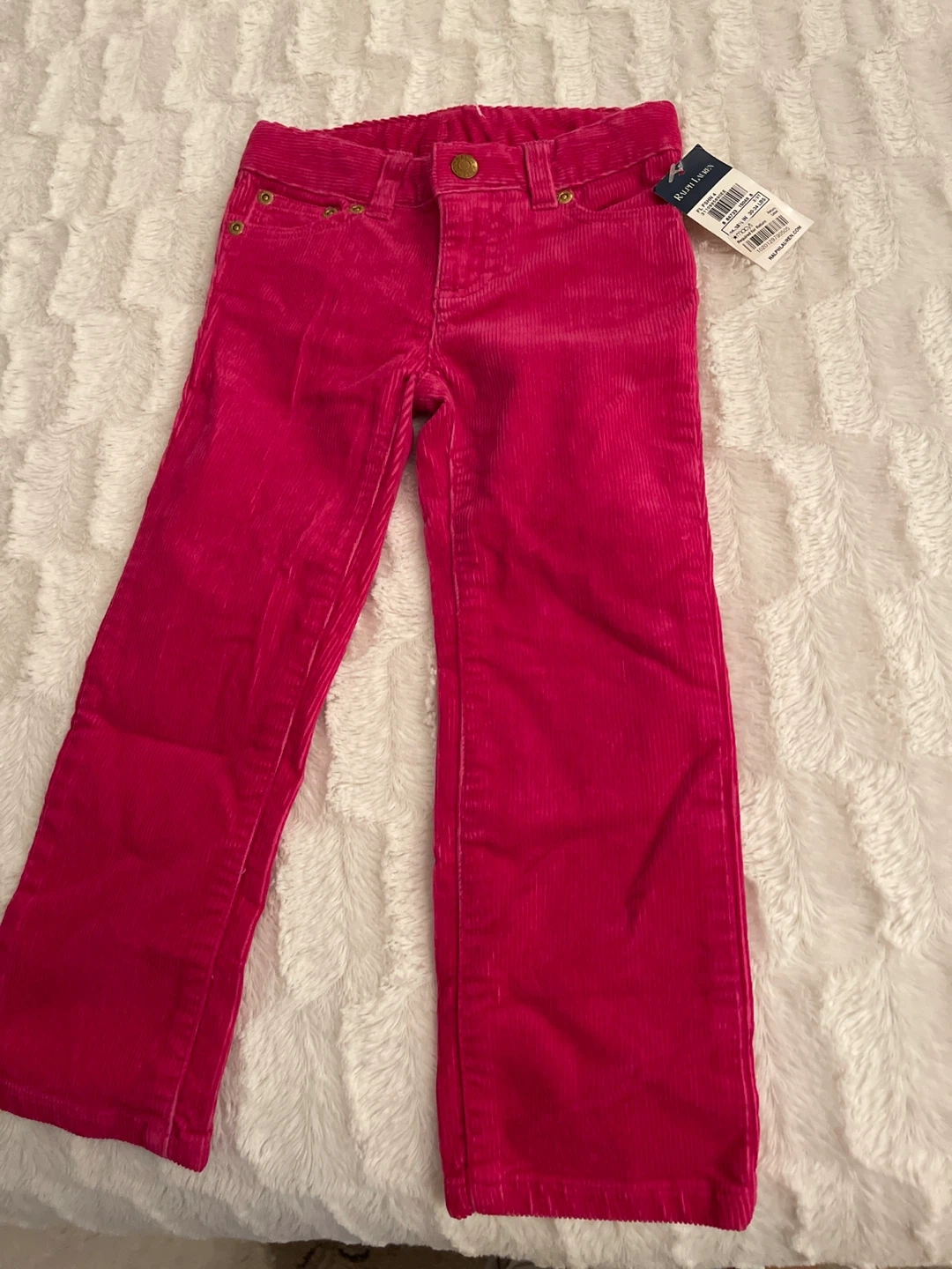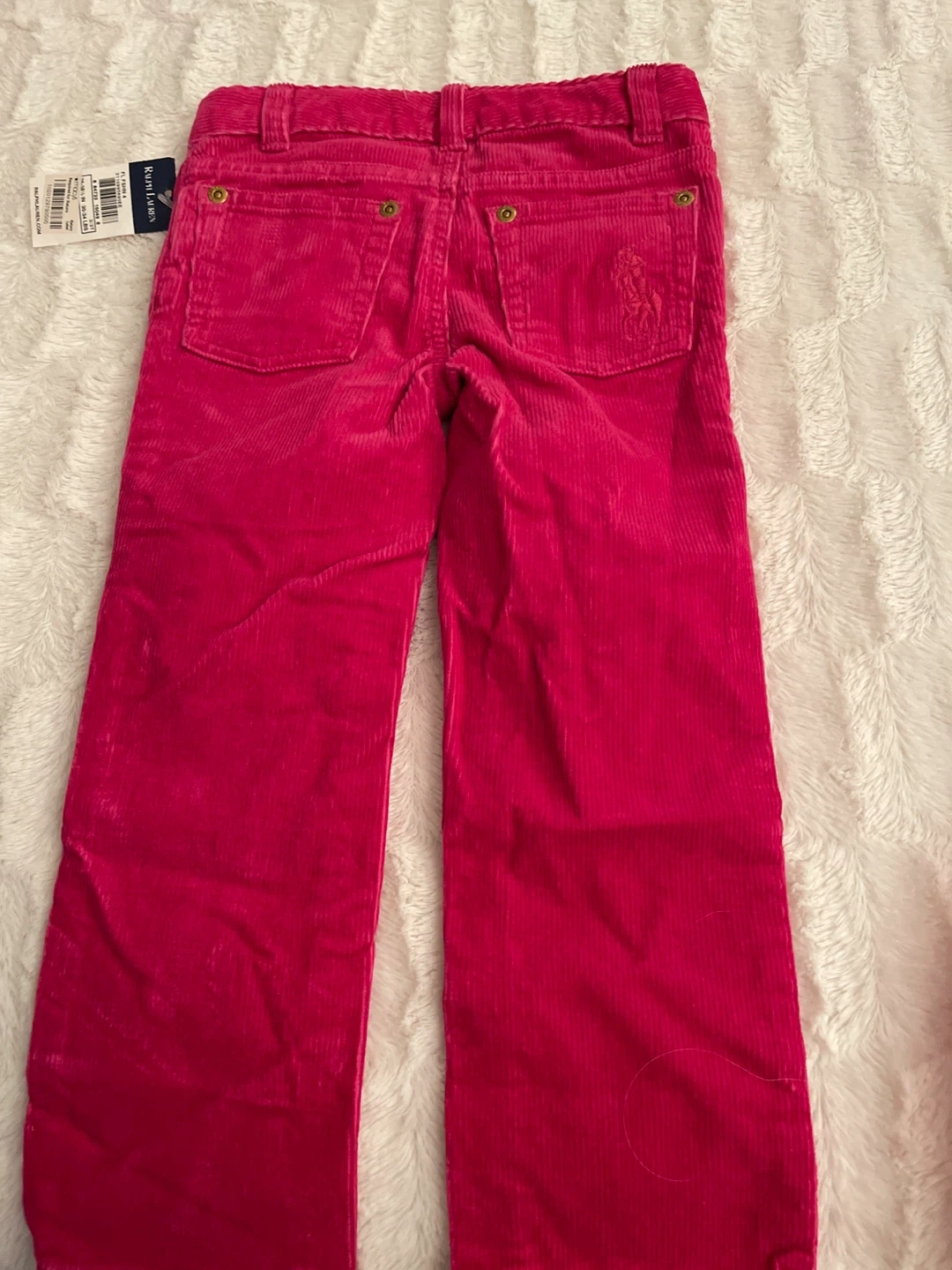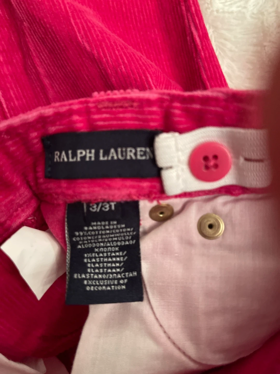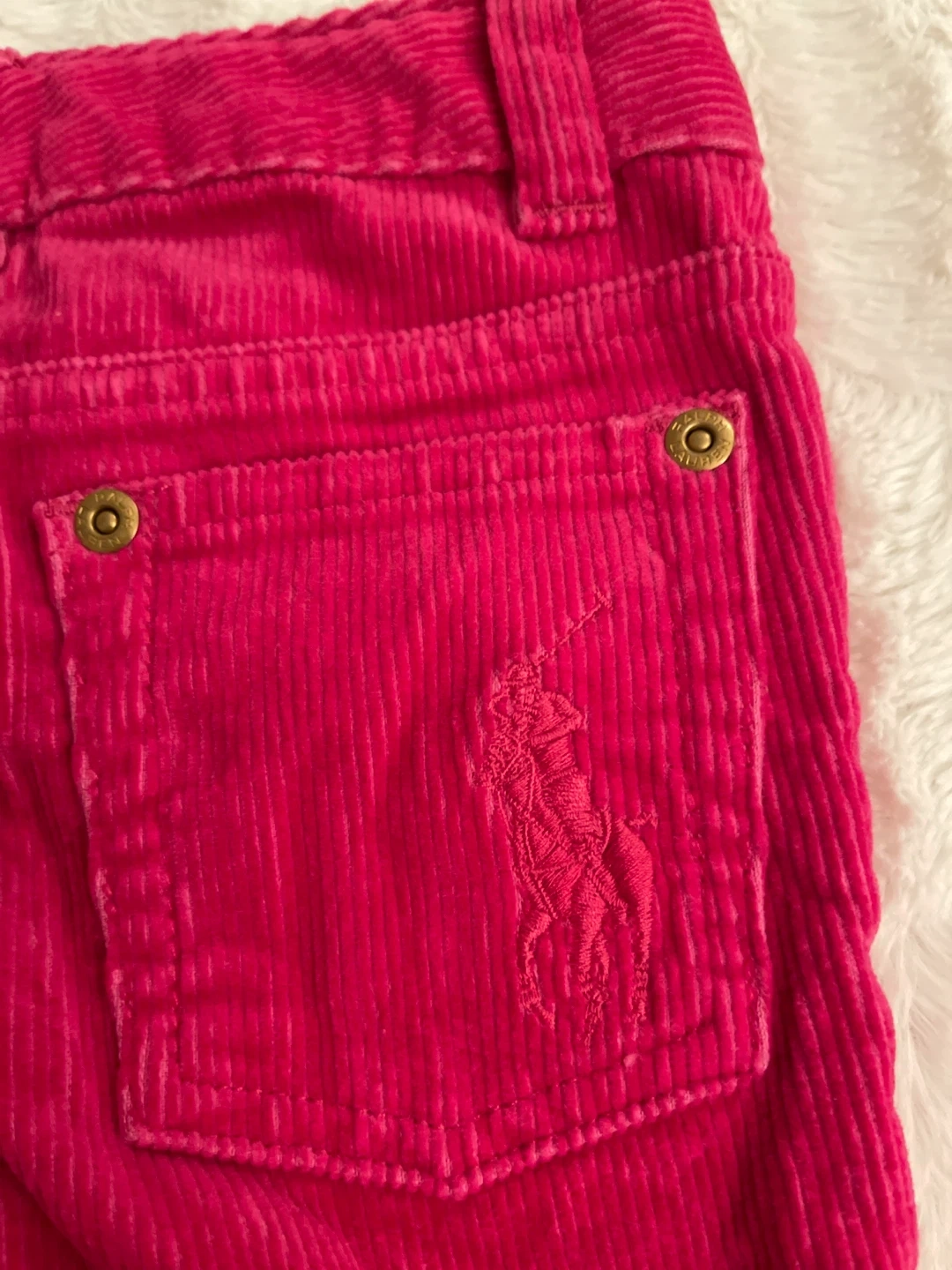 These adorable Ralph Lauren corduroy pants are in a vibrant pink color and size 3/3T! They feature a classic corduroy texture and the iconic Ralph Lauren logo on the back pocket. Perfect for your little one's wardrobe!