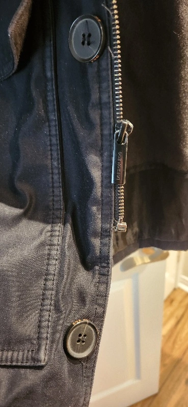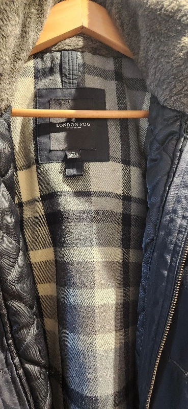 Men's dark navy blue jacket. Features a hood, zip and button closure, and plaid lining. Two front pockets. Good for colder weather. Was$300+tx new at the Bay.