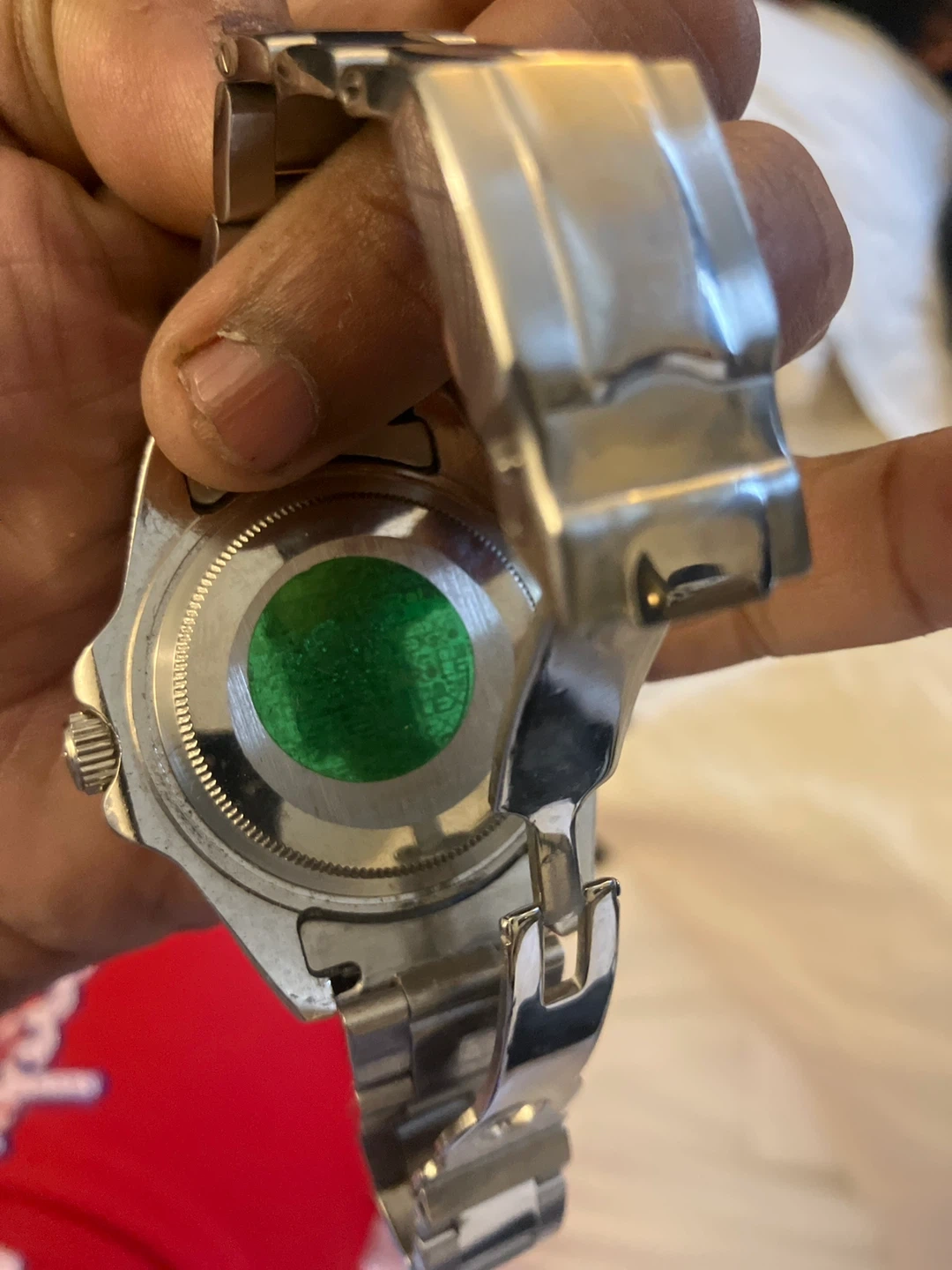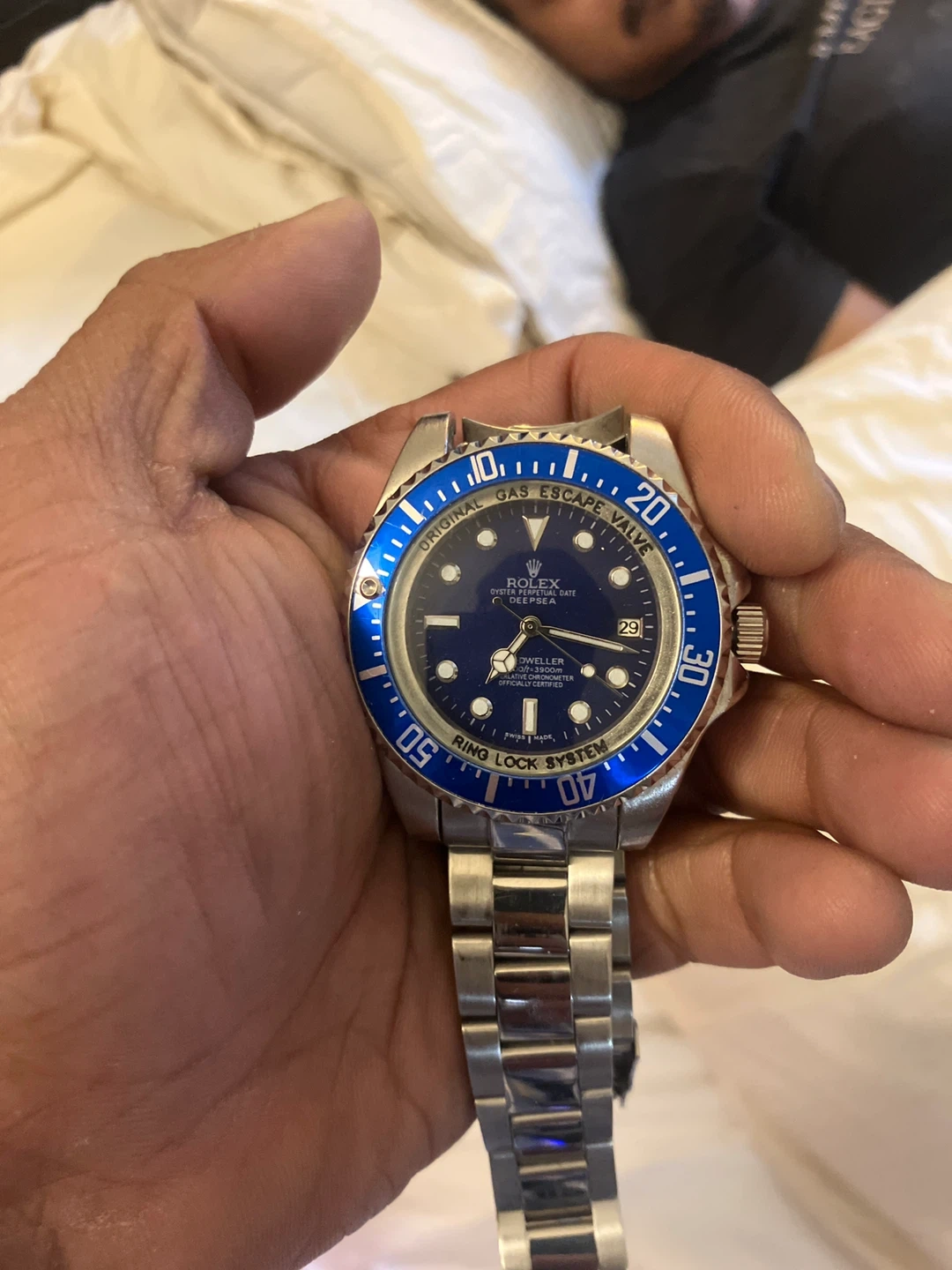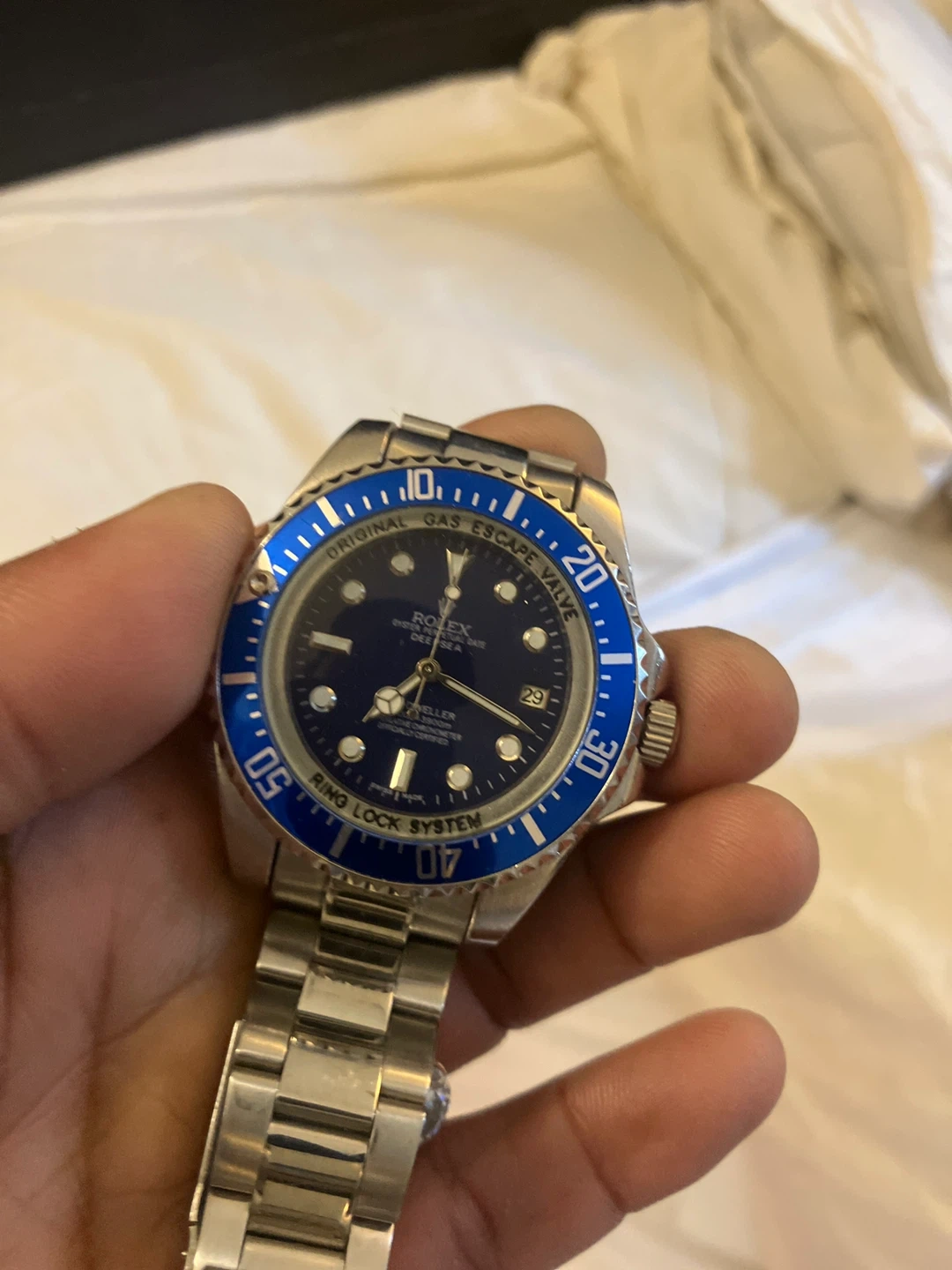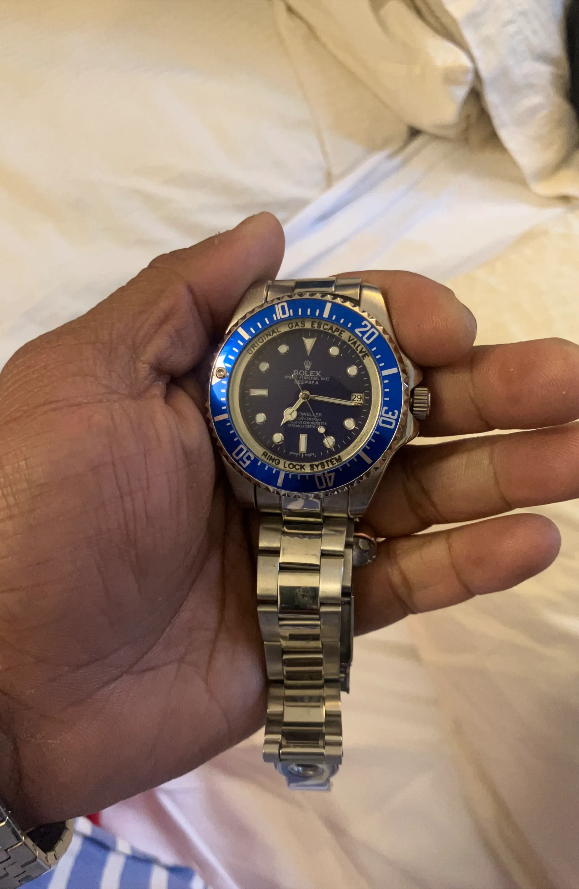 This is a Rolex Submariner watch with a blue dial and bezel. It features an automatic movement and a stainless steel band. The watch is in good condition and ready for a new owner!