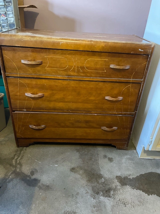 This charming wood dresser features three spacious drawers, perfect for organizing your wardrobe. It's a solid piece of furniture with a lot of character, ideal for a DIY project. Embrace its vintage vibe and transform your bedroom into a cozy retreat! If the ad is up, it's still available!