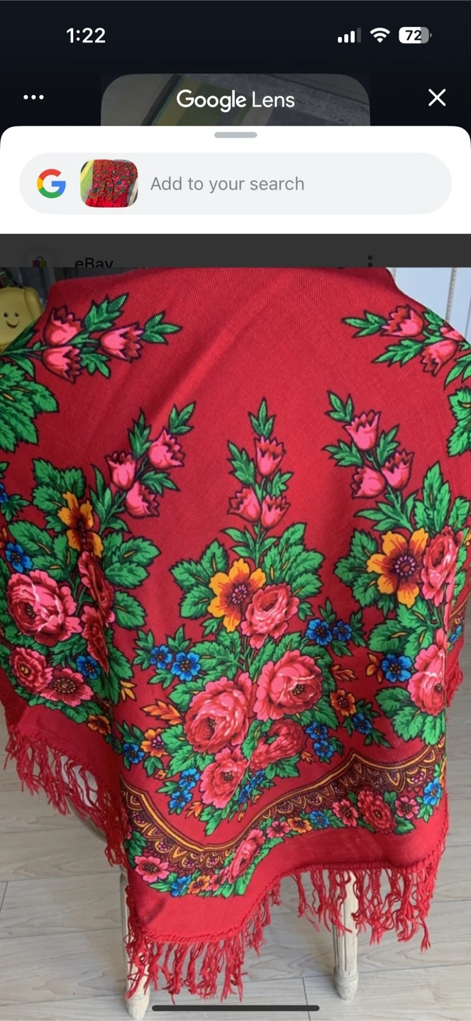 Vibrant red scarf featuring a bold floral print. It has a decorative border and fringed edges. This scarf's eye-catching design makes it a beautiful accessory!