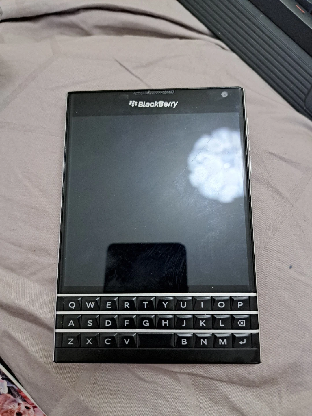 This is a BlackBerry Passport smartphone in black. It features a full QWERTY keyboard and a large touchscreen. This phone offers a unique user experience for productivity and communication.