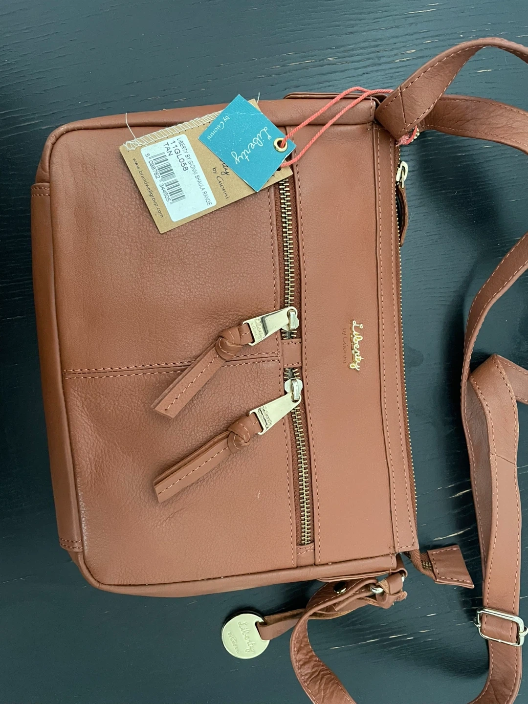 This is a Liberty by Gionni Shaula Range crossbody bag. It's a tan leather material with a zippered closure. The adjustable strap makes it comfortable to wear. Brand new with tags on.