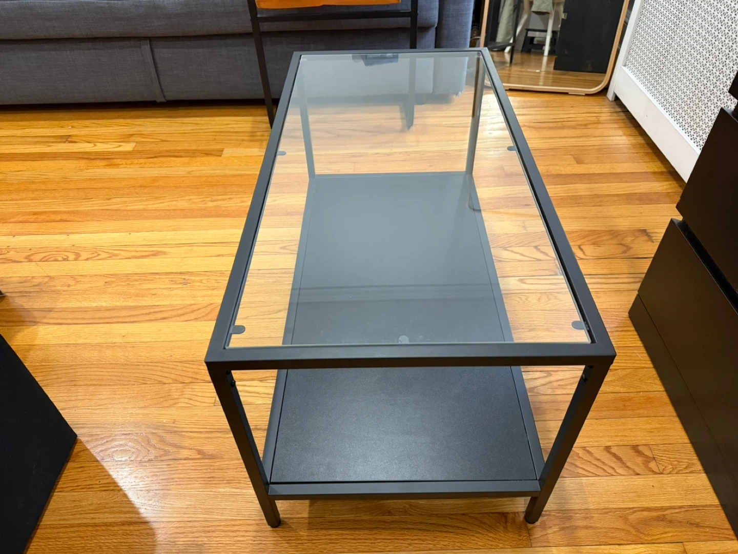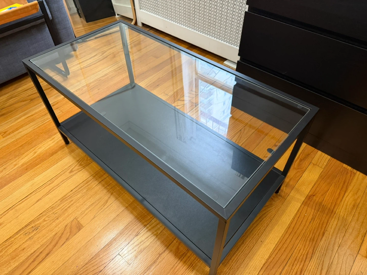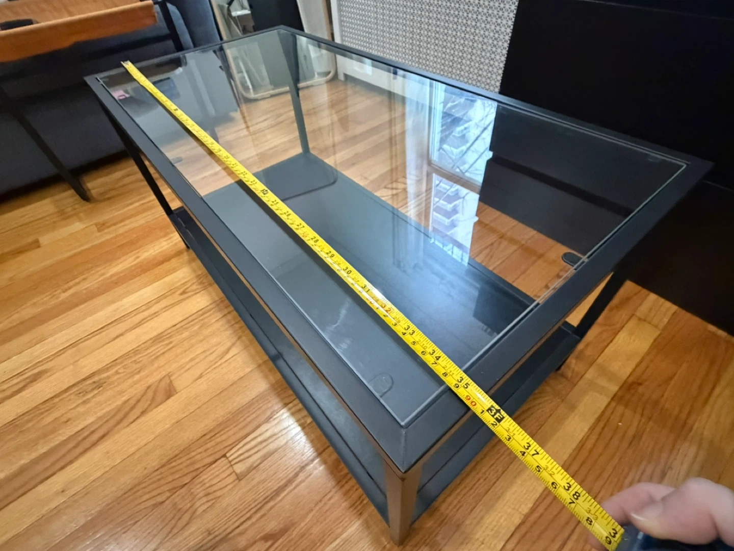 This coffee table features a sleek design with a glass top and a lower shelf for storage. Its metal frame is black, and it's about 39 inches long. It's a great addition for your living room!