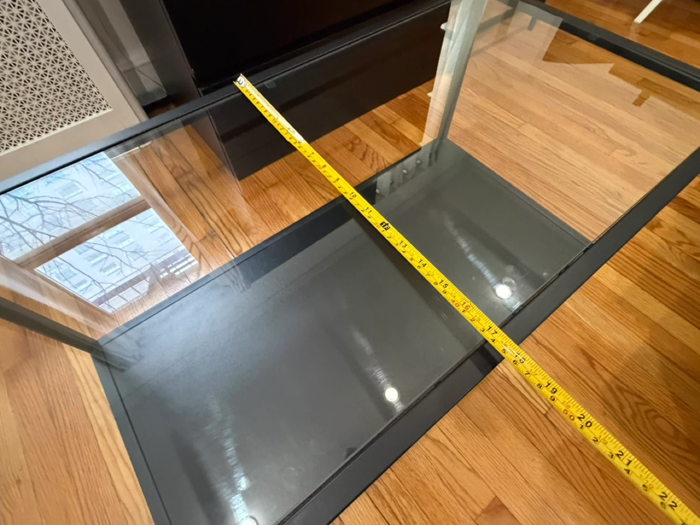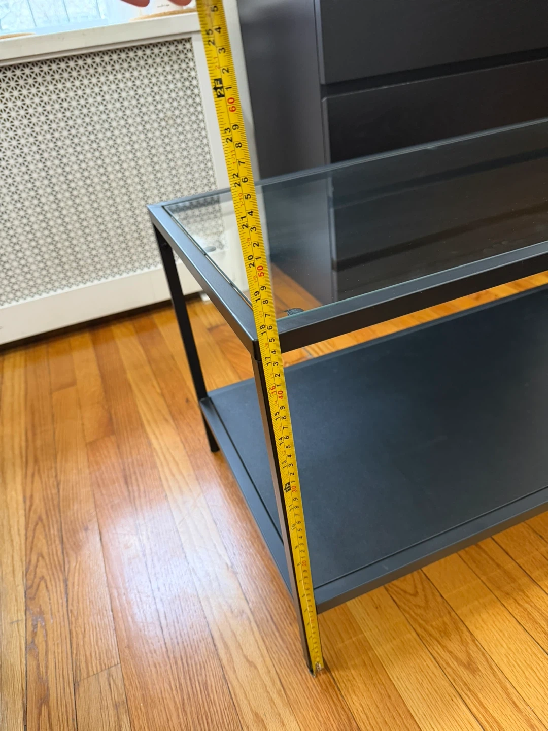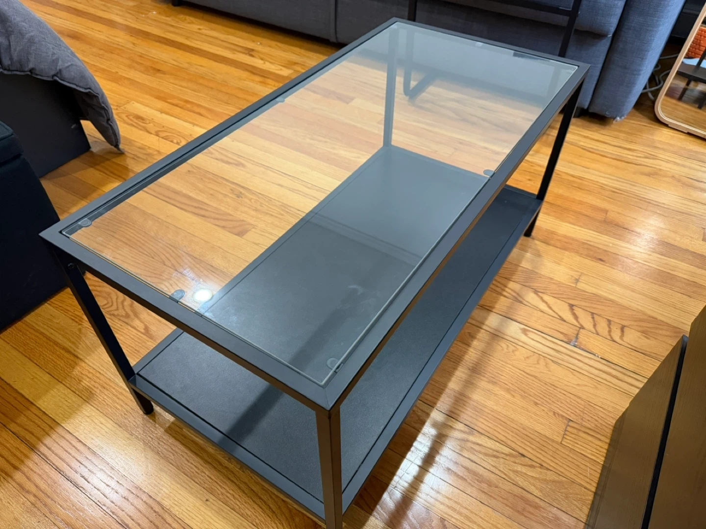 This coffee table features a sleek design with a glass top and a lower shelf for storage. Its metal frame is black, and it's about 39 inches long. It's a great addition for your living room!