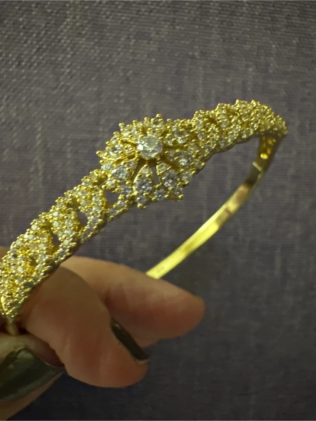 This elegant bangle features a floral design encrusted with clear cubic zirconia crystals. It's crafted with a gold-tone metal. It's a beautiful piece for special occasions or everyday wear!