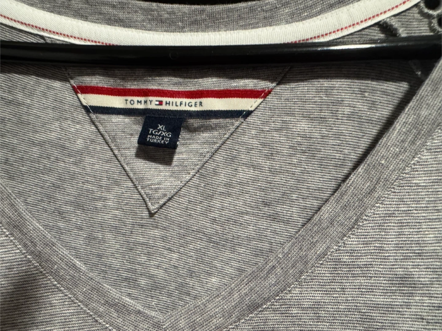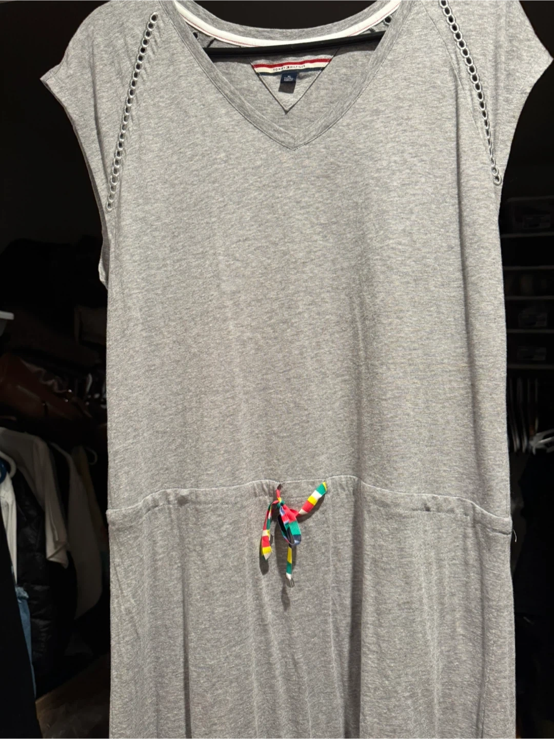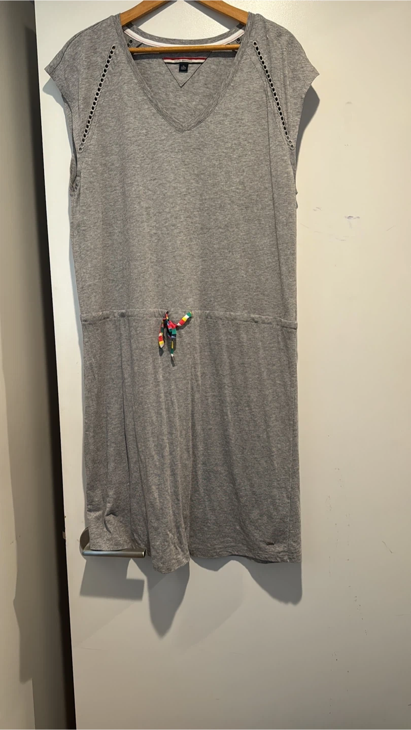 Tommy Hilfiger gray jersey dress with v-neck and drawstring waist. Features cut-out details on the shoulders. Size XL, made in Turkey. 100% cotton fabric.