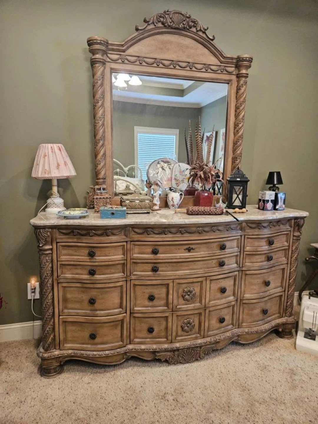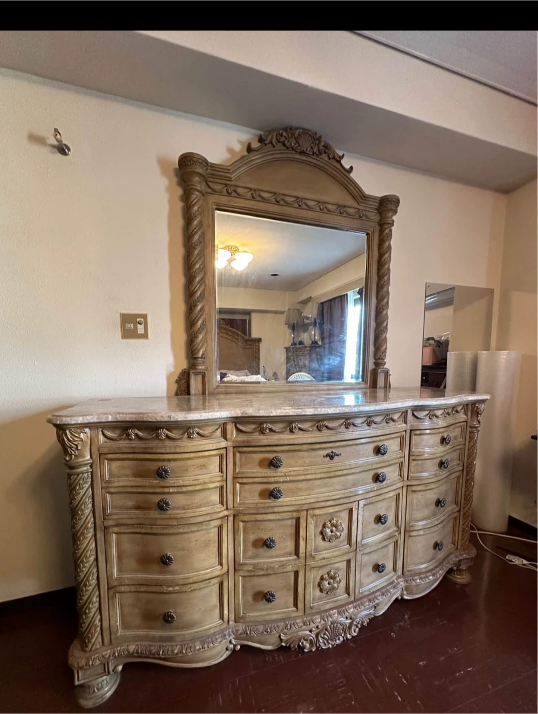 A large wooden dresser featuring ornate carvings and a matching mirror. It has multiple drawers for ample storage. The top surface appears to be marble or a similar stone.