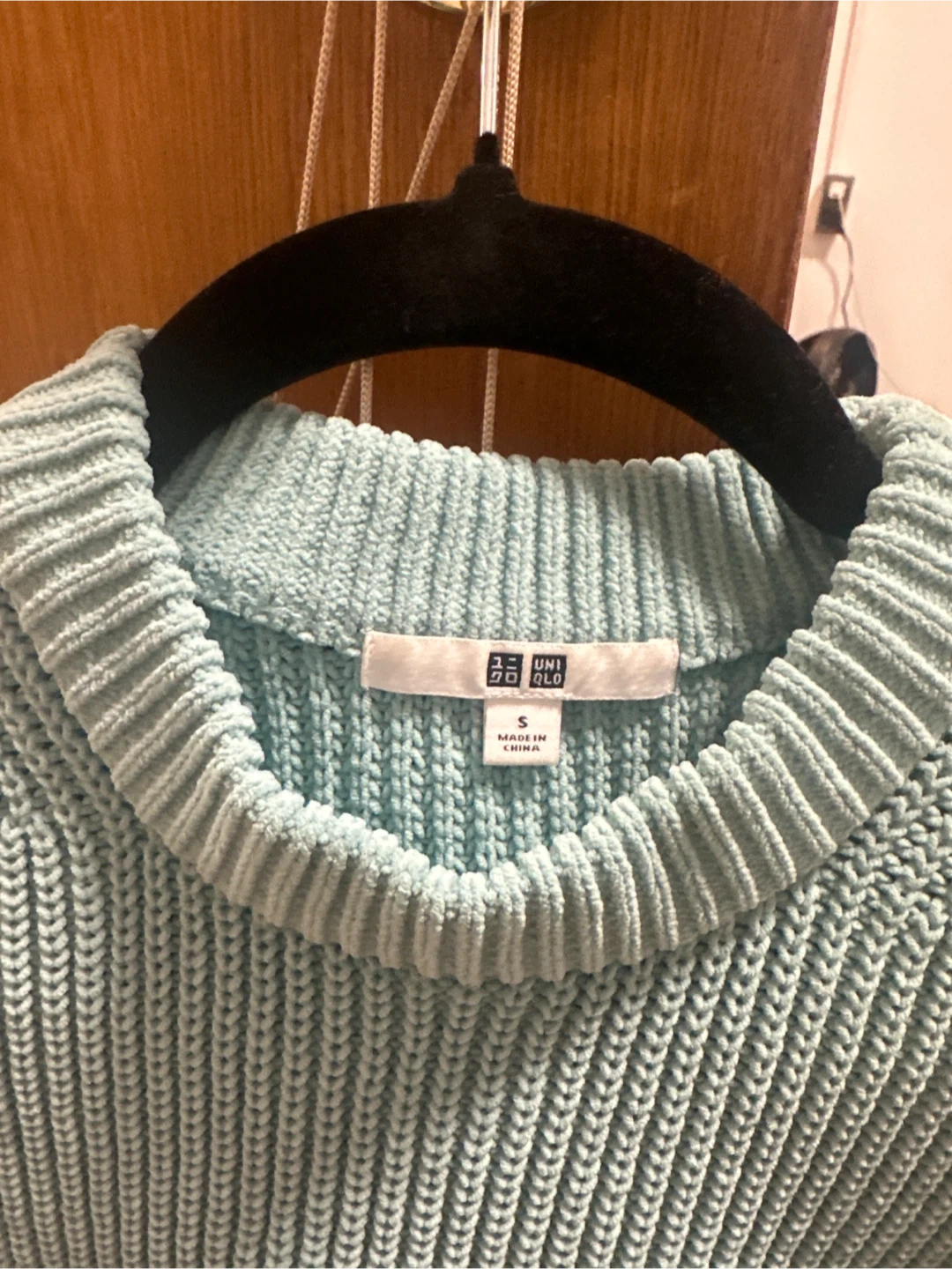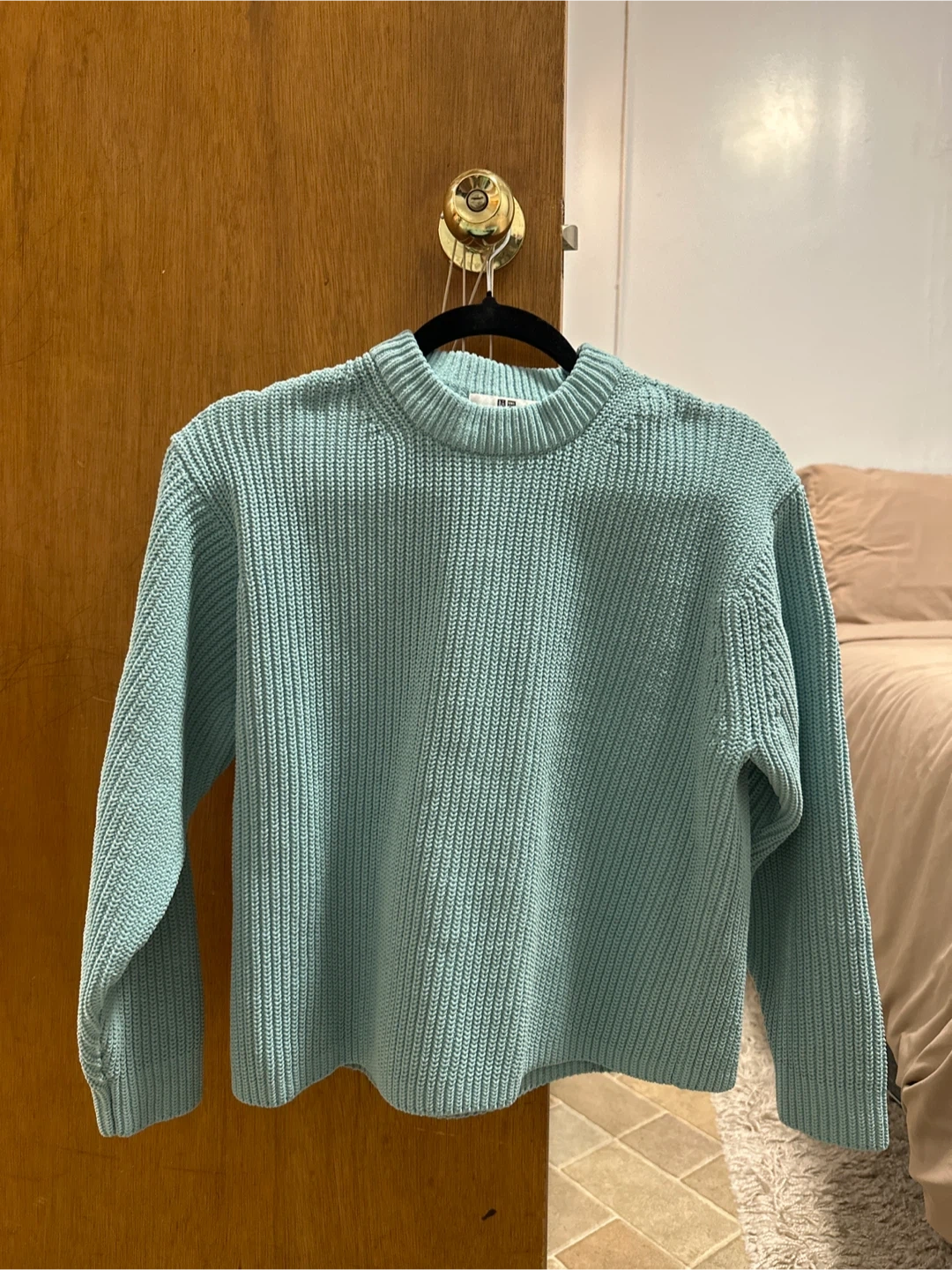 This is a UNIQLO crewneck sweater in a light aquamarine. It's a size small. The knit fabric is comfortable and has a nice texture. Worn less than 5 times.