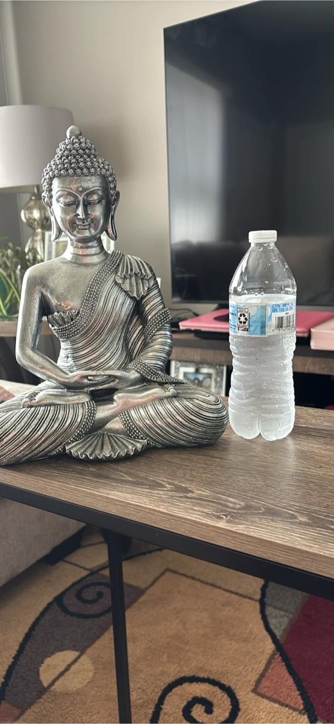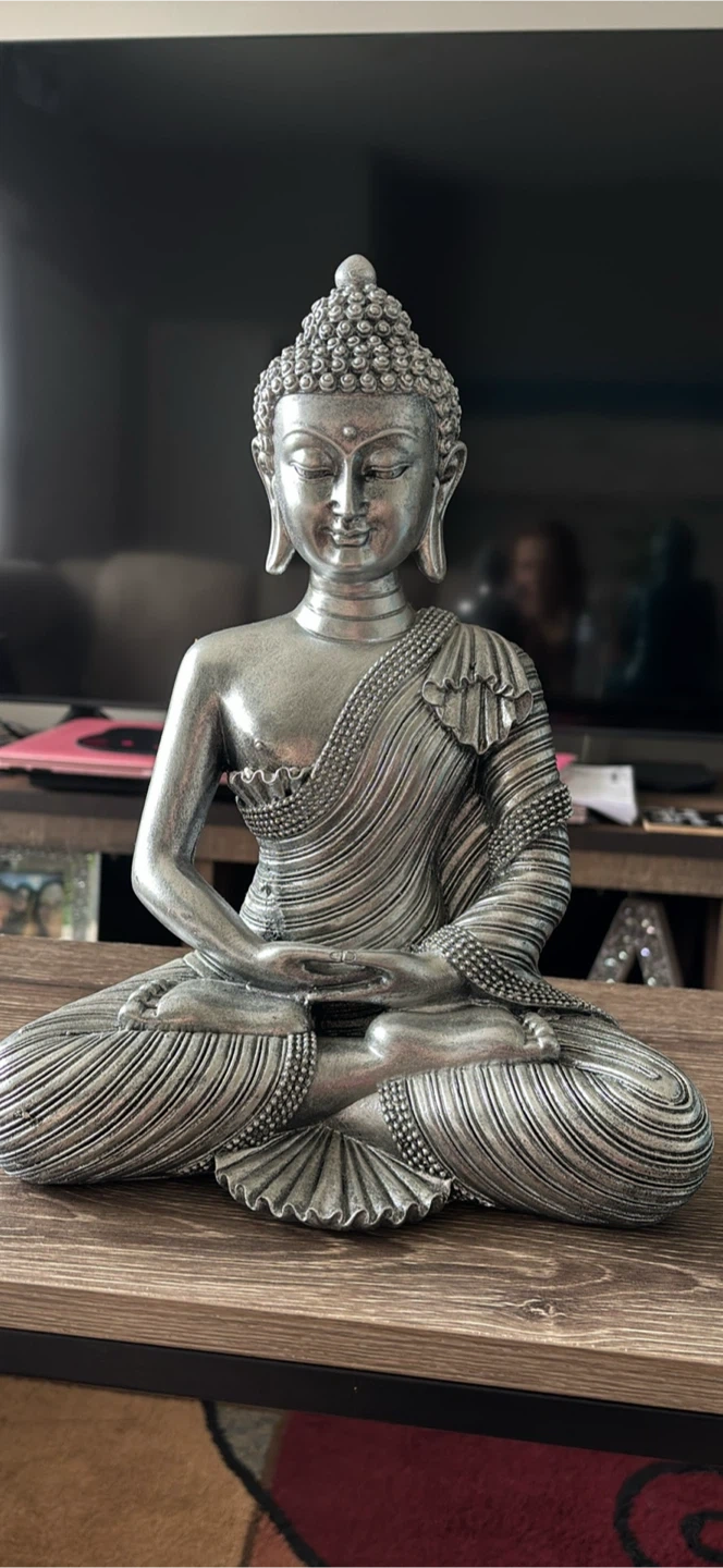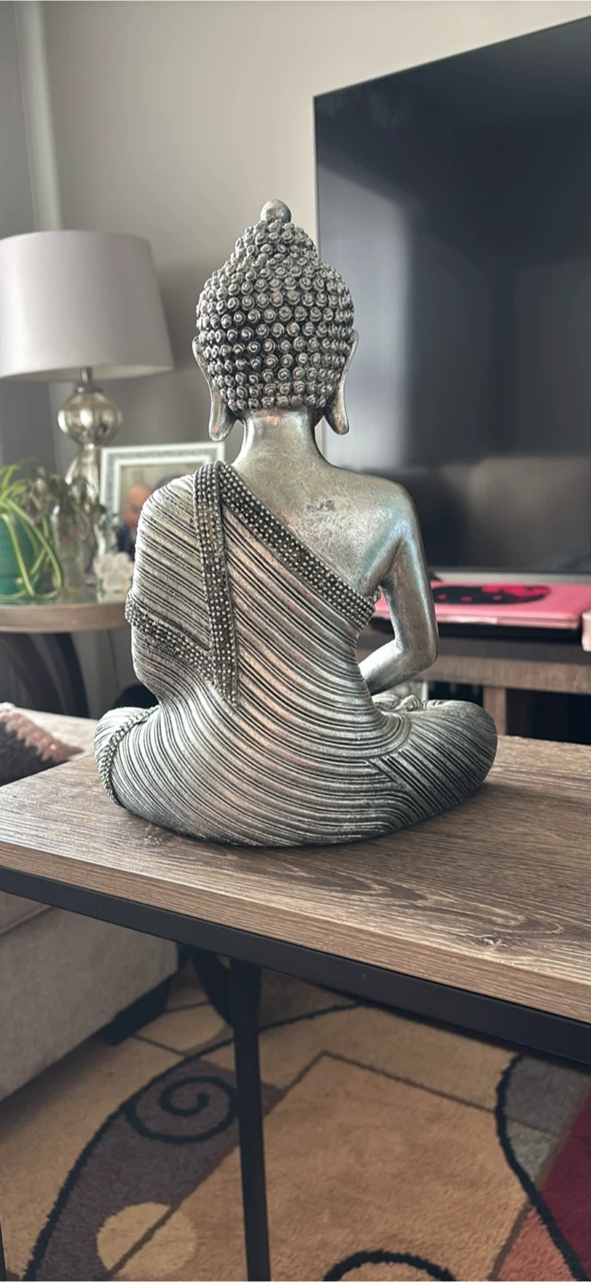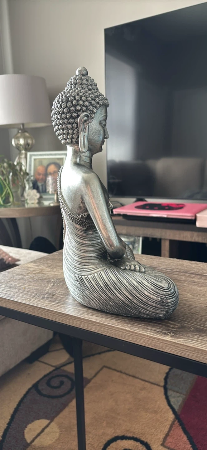 This is a sitting Buddha figurine. It's made of a metallic silver material with intricate detailing on the robe and hair. It's a decorative piece that brings a sense of calm and tranquility.