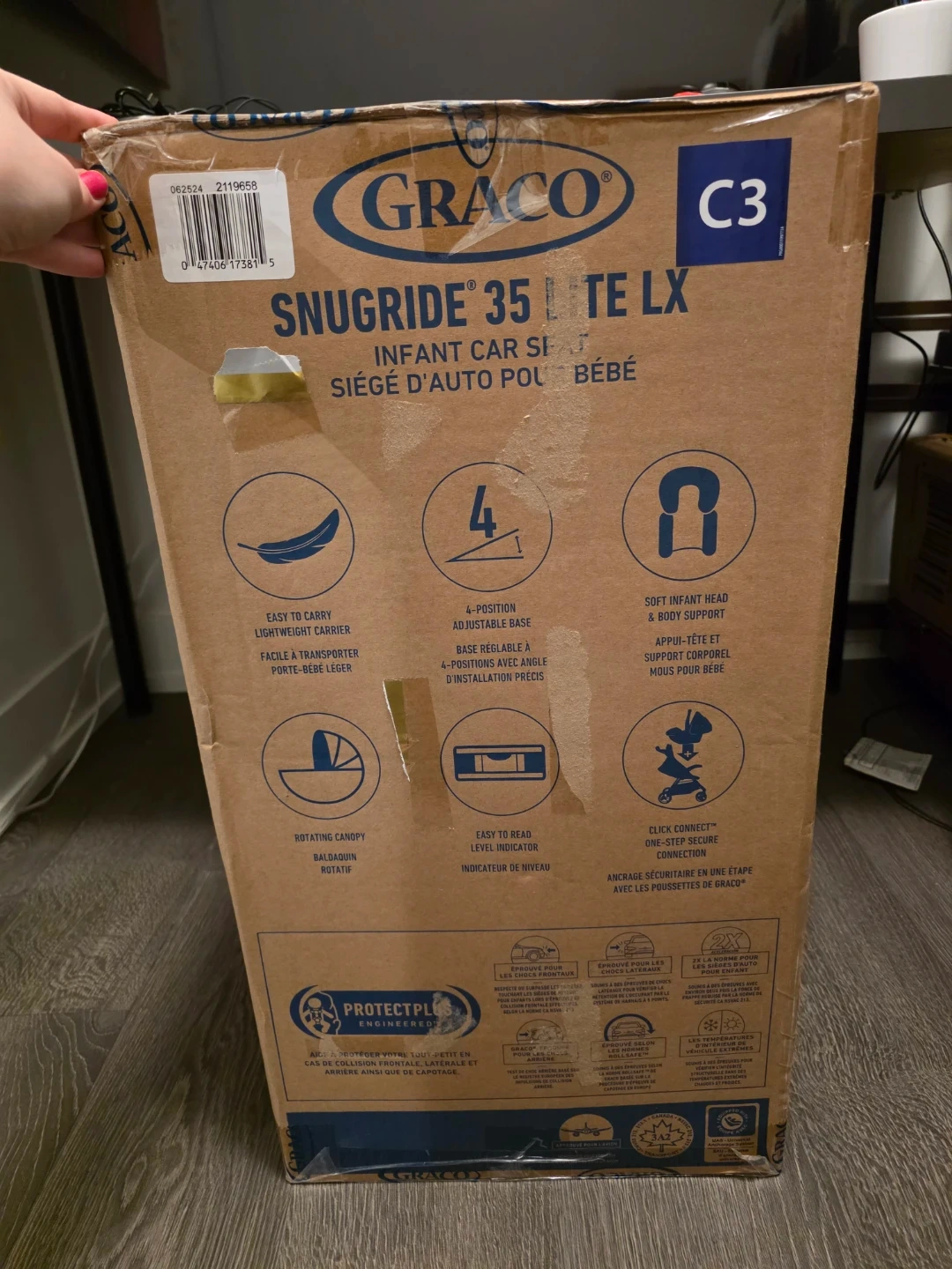 This Graco SnugRide 35 Lite LX is an infant car seat designed for babies weighing 1.8-16 kg (4-35 lbs). It's lightweight and easy to carry with a rotating canopy and soft infant head support. The base features a 4-position adjustable recline and a Click Connect system for secure installation. Manufactured in June 2024.