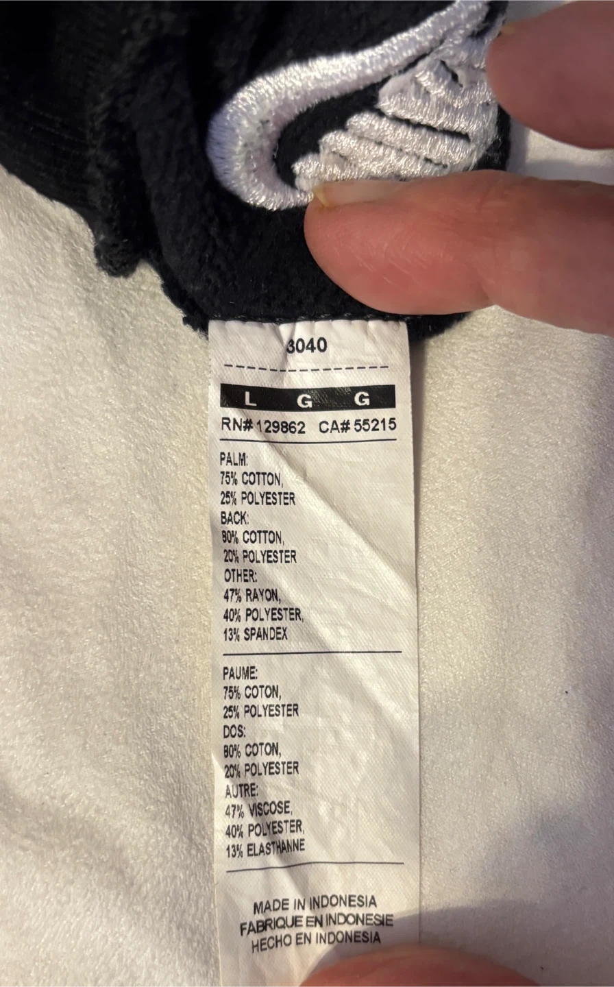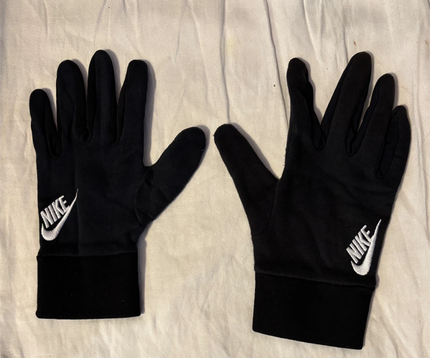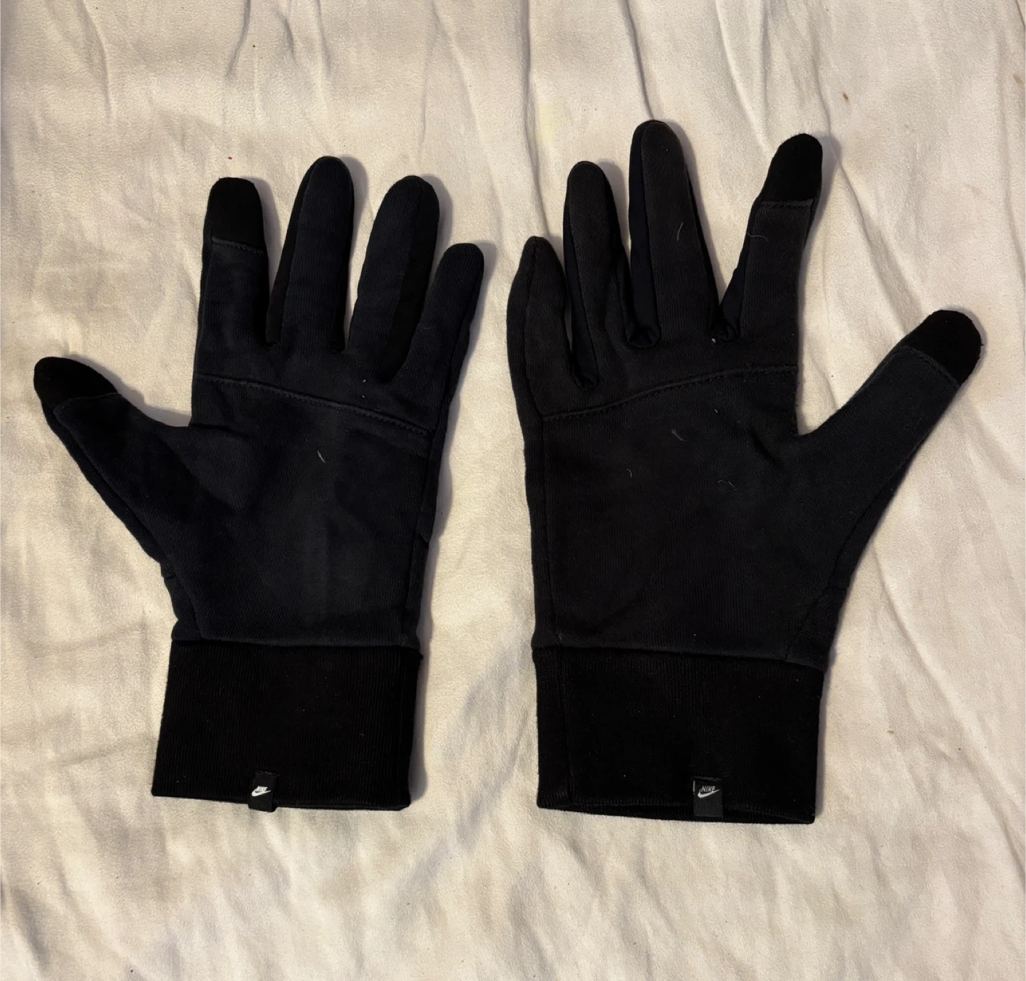 Keep your hands warm on those chilly runs with these Nike lightweight tech running gloves! They are black and size large. Slight wear colour fading due to use. The palm is made of 75% cotton and 25% polyester, while the back is 80% cotton and 20% polyester. Thumb and index fingers have tips to enable using smart phone.