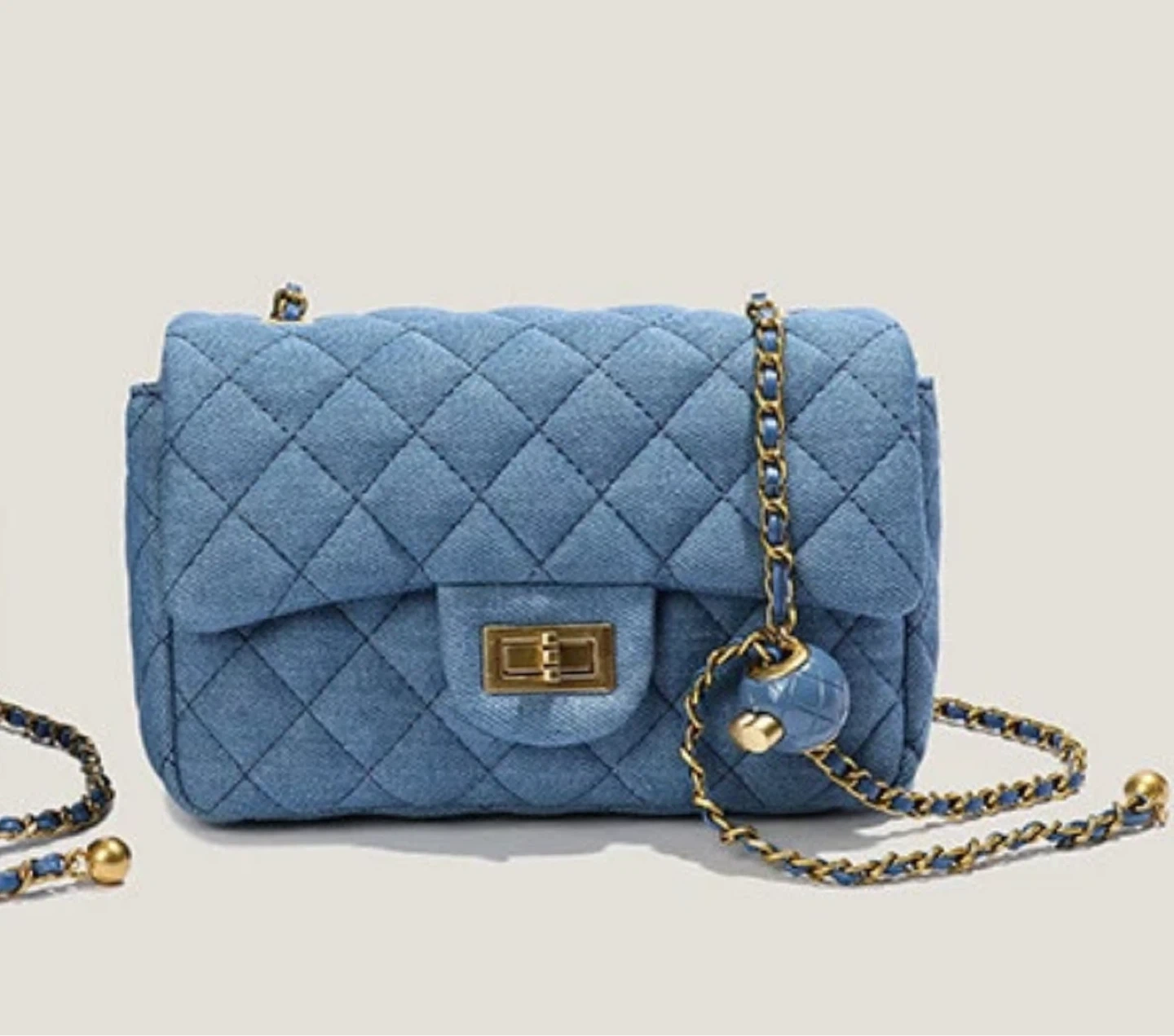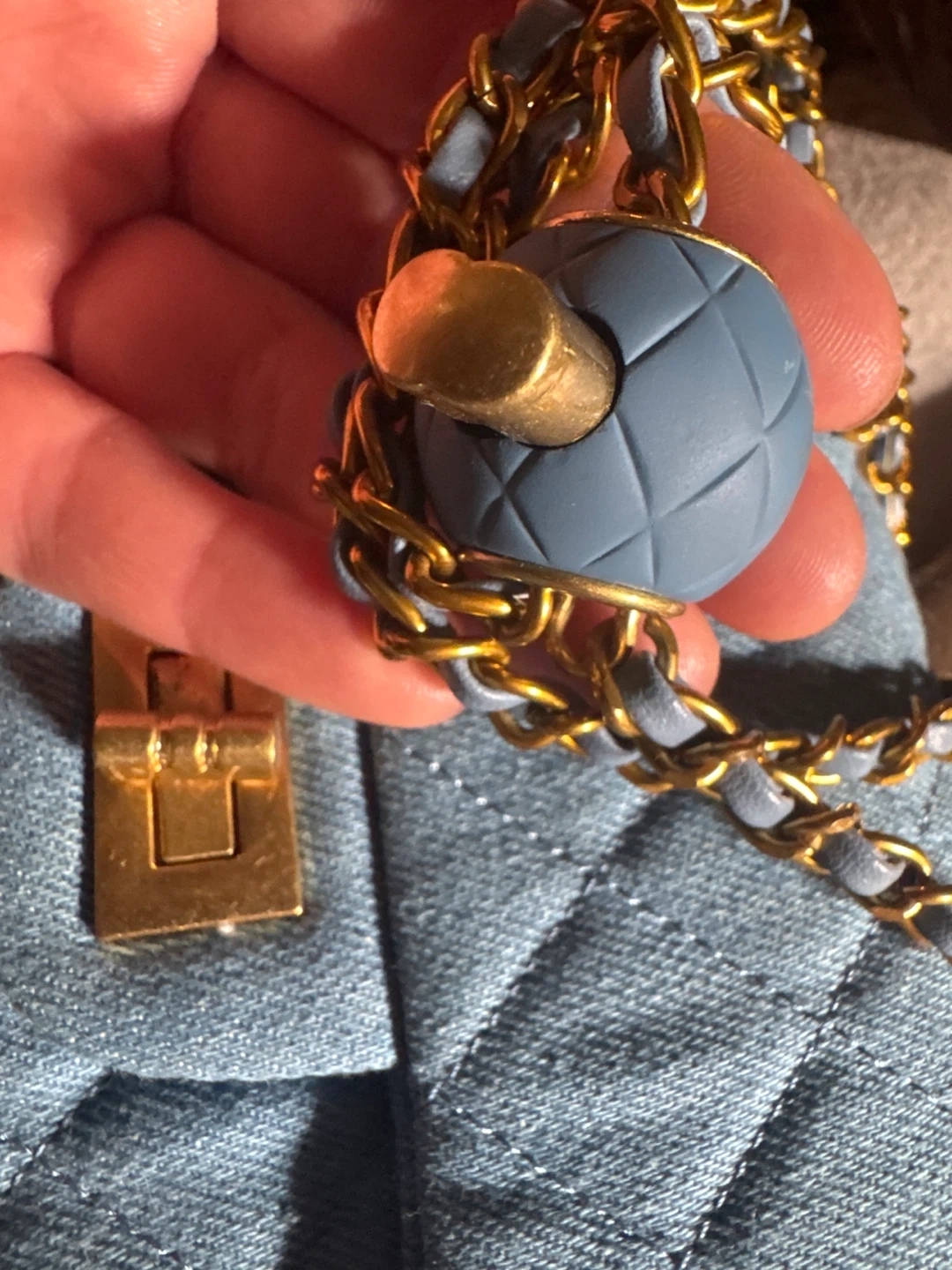 Cute blue denim quilted chain bag in great condition! The bag features a gold-tone chain strap and a unique ball charm that’s expandable which makes it versatile as it can be worn different ways