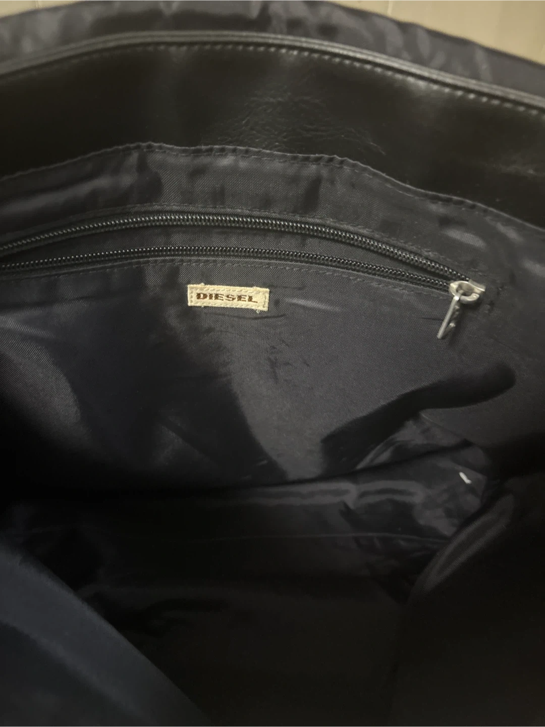 This black messenger bag is from Diesel. It features a large main compartment with a zippered interior pocket. The exterior has a flap closure with the Diesel logo prominently displayed. Its adjustable strap makes it comfortable to wear.