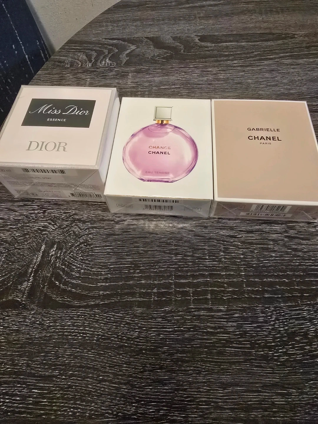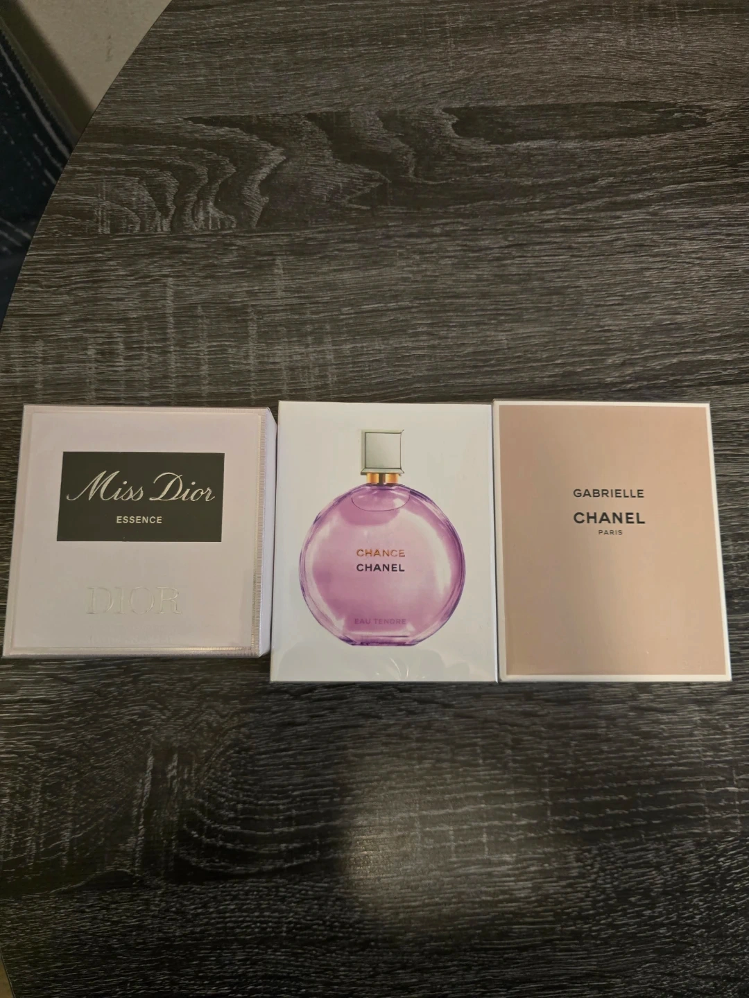 This set includes three fragrances: Chanel Chance Eau Tendre, Dior Miss Dior Essence, and Chanel Gabrielle. All fragrances are in their original packaging.