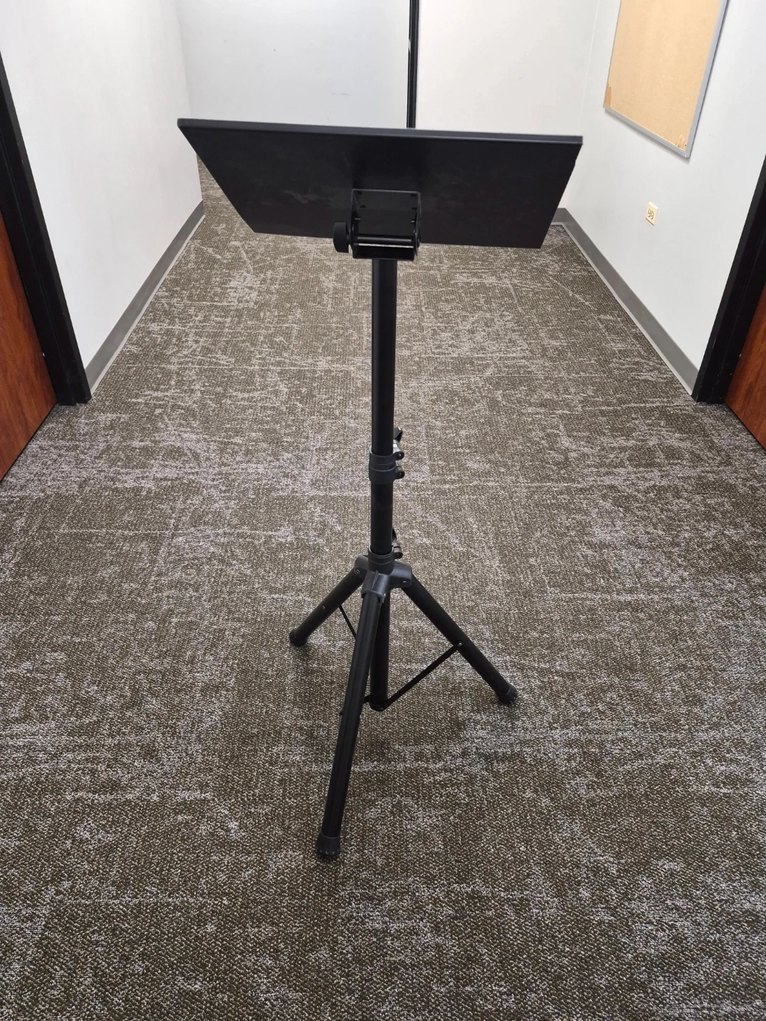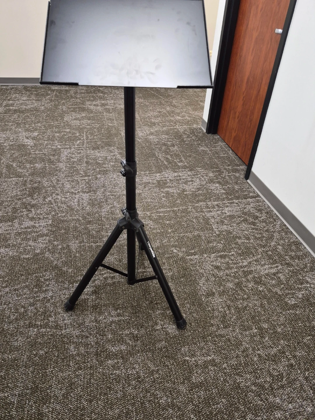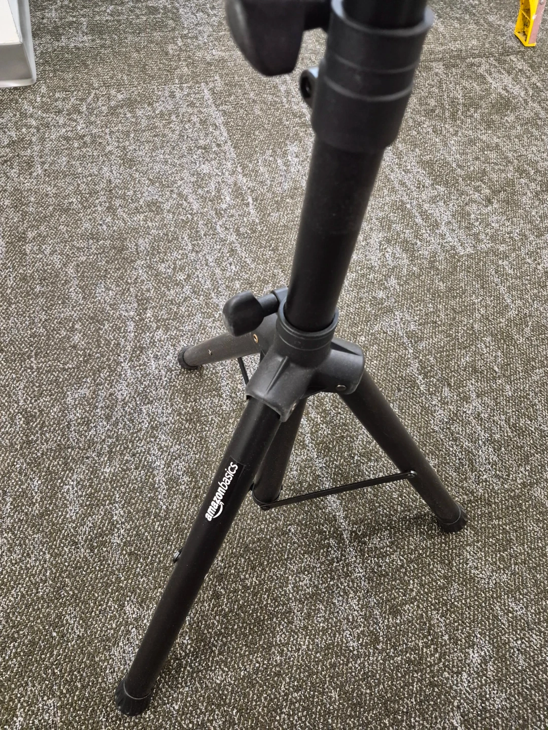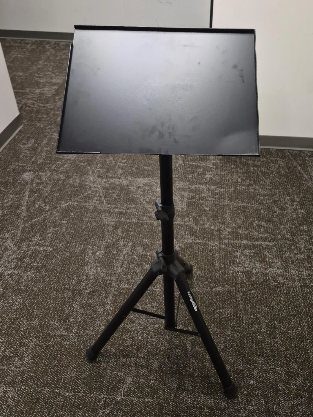 This is an adjustable black music stand from Amazon Basics. It's made of metal and has a tripod base for stability. The height is adjustable and the tray can tilt for optimal viewing.
