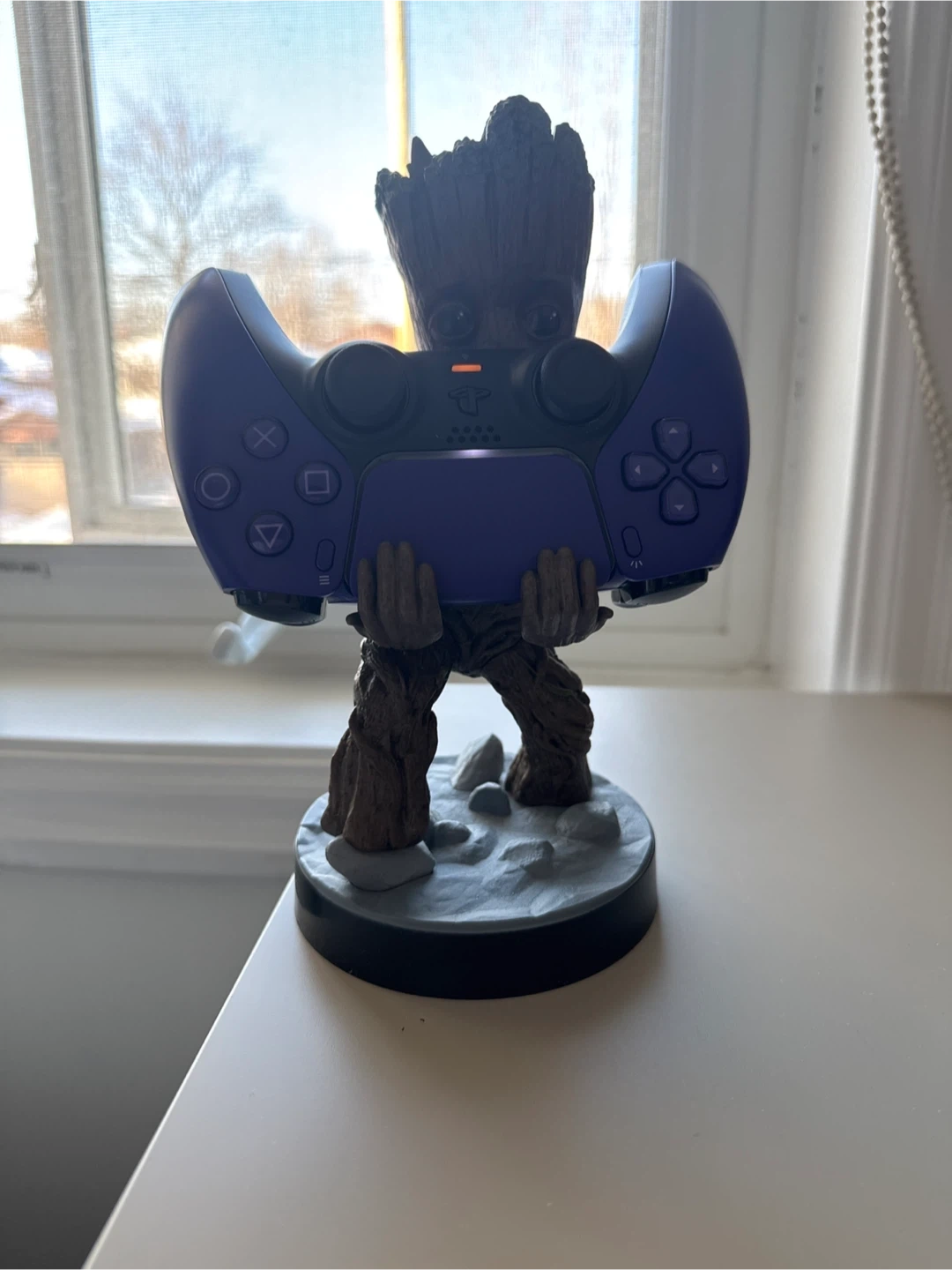 This is a Groot figure that holds your gaming controller. It's made of plastic and features a detailed design. It's great for keeping your controller organized and on display!
