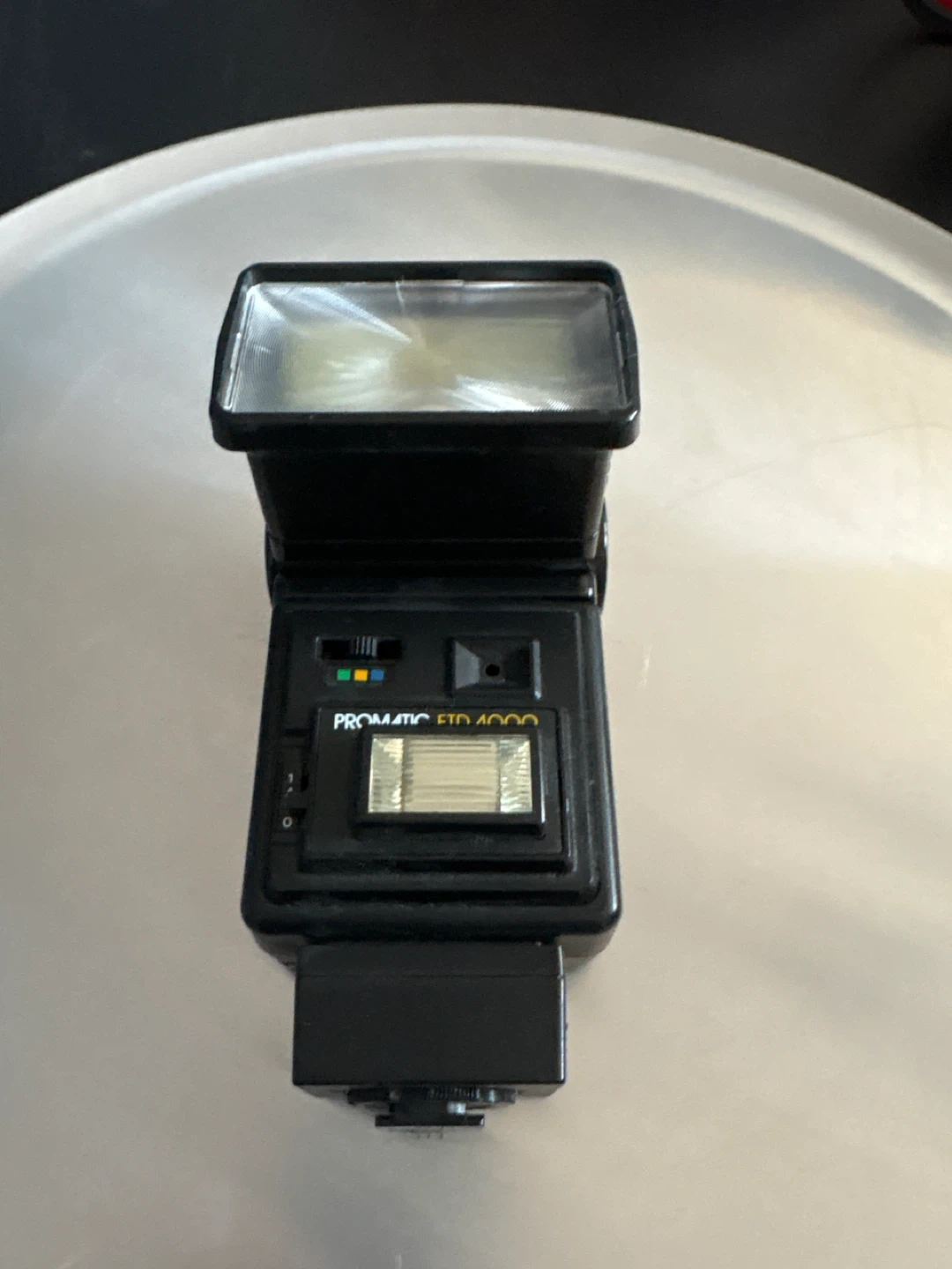 This is a Promatic LTD 4000 camera flash. It's black plastic construction. This flash is designed for photography.