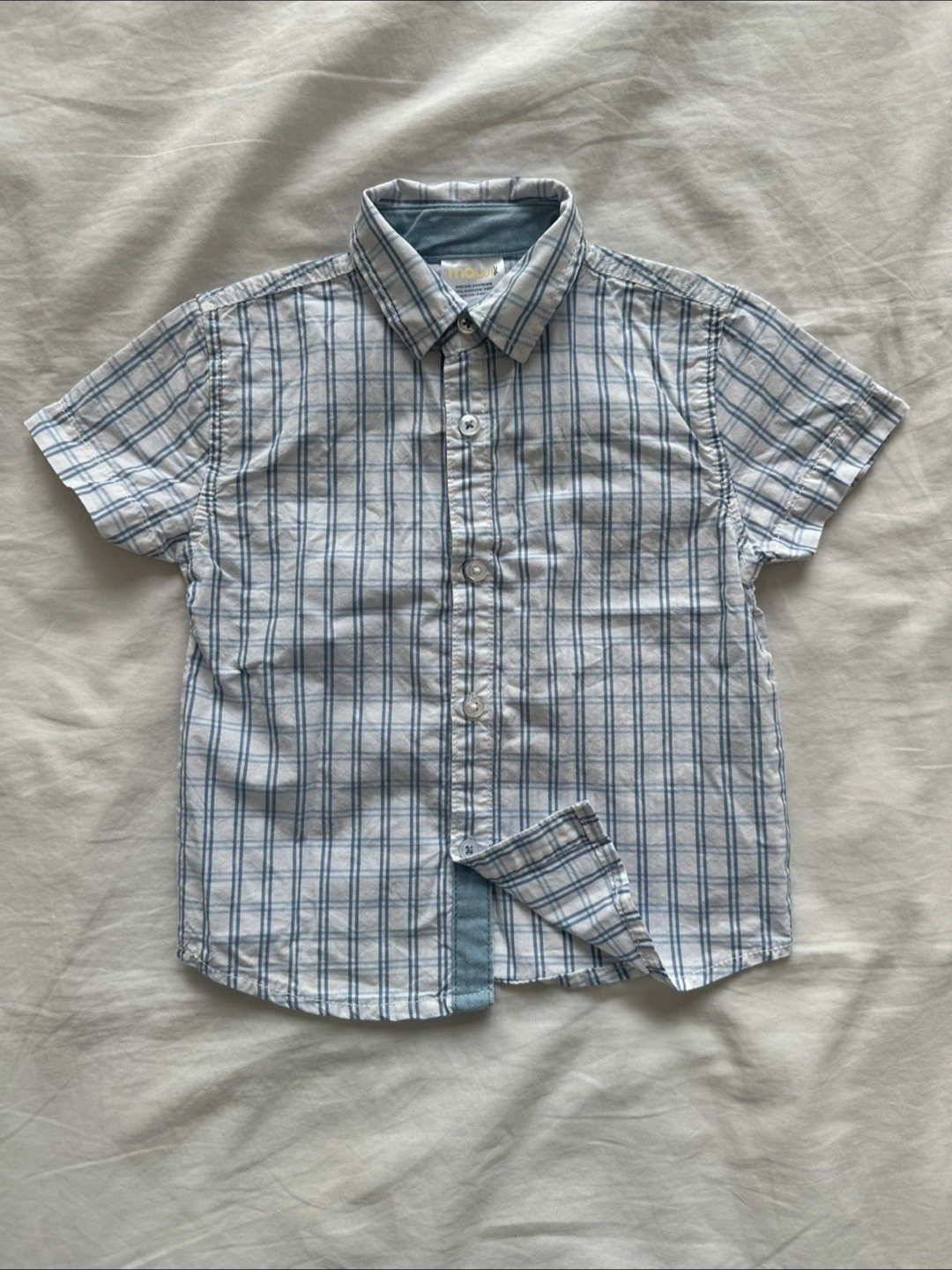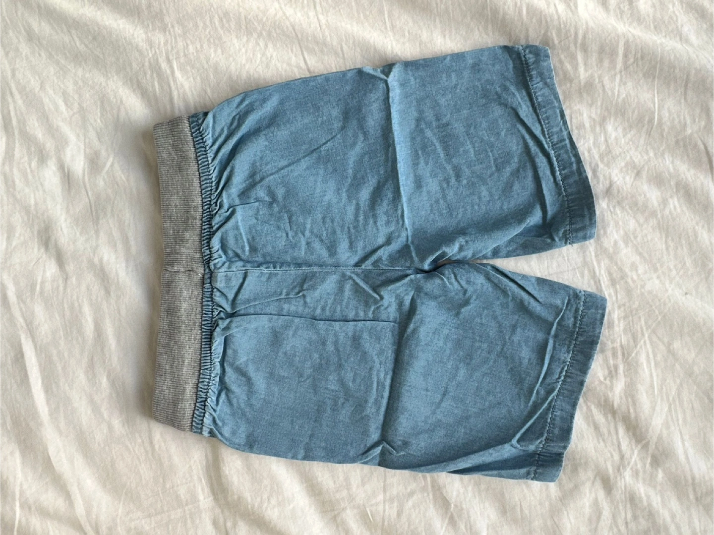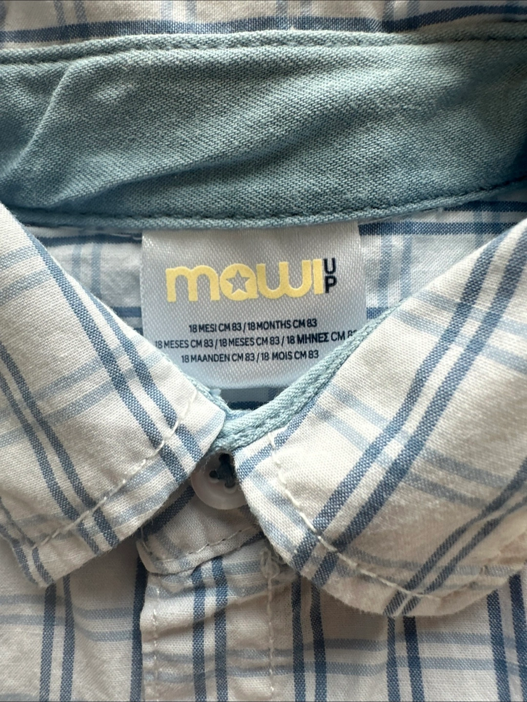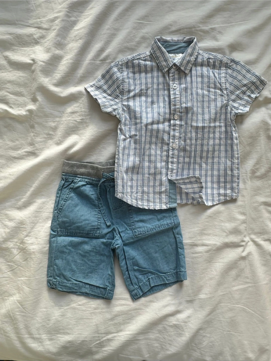 This set includes a short-sleeved plaid button-up shirt and denim shorts. The shirt is made of 100% cotton. The shorts have an elastic waistband with a drawstring. It's sized for 18 months.