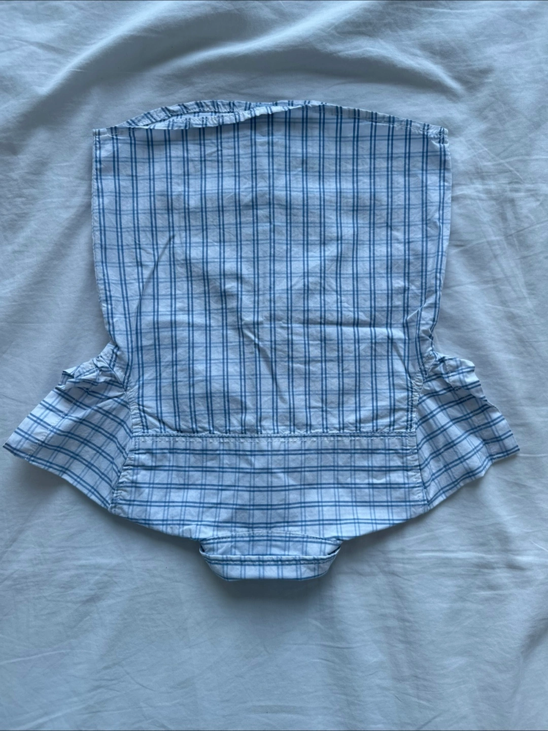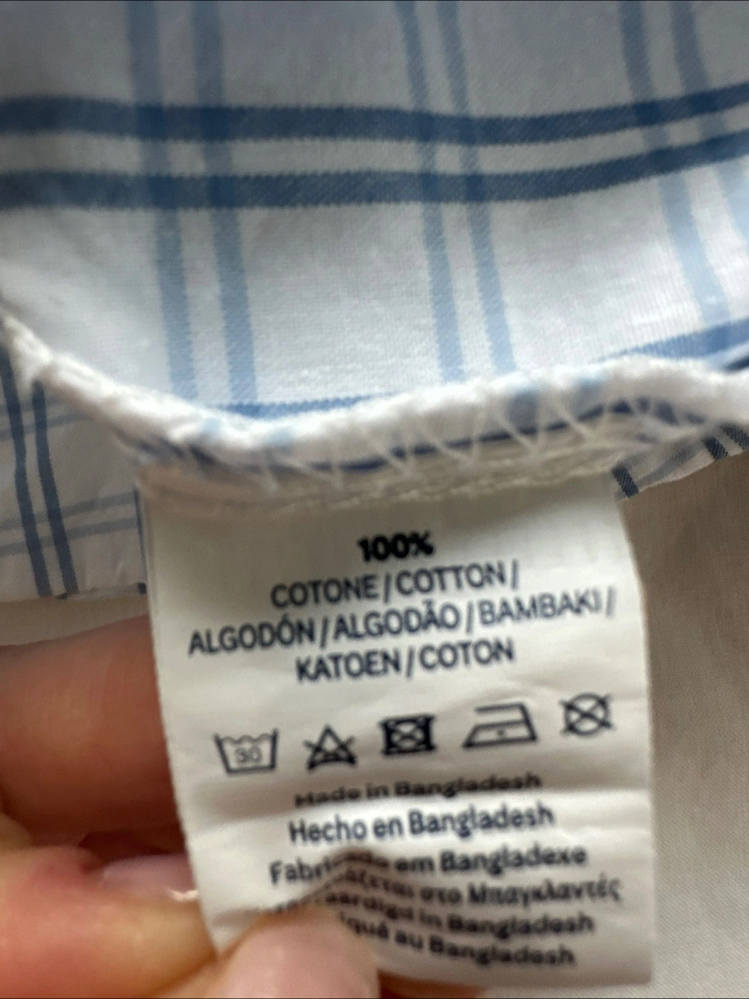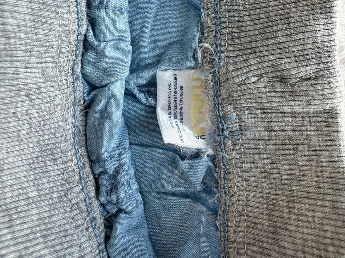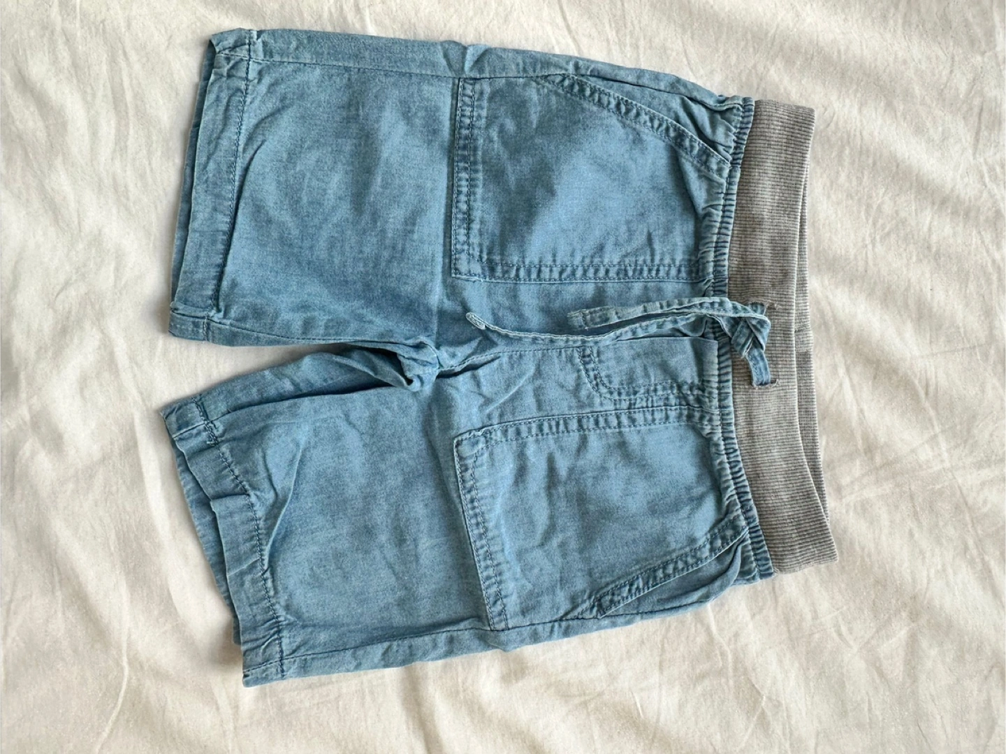 This set includes a short-sleeved plaid button-up shirt and denim shorts. The shirt is made of 100% cotton. The shorts have an elastic waistband with a drawstring. It's sized for 18 months.