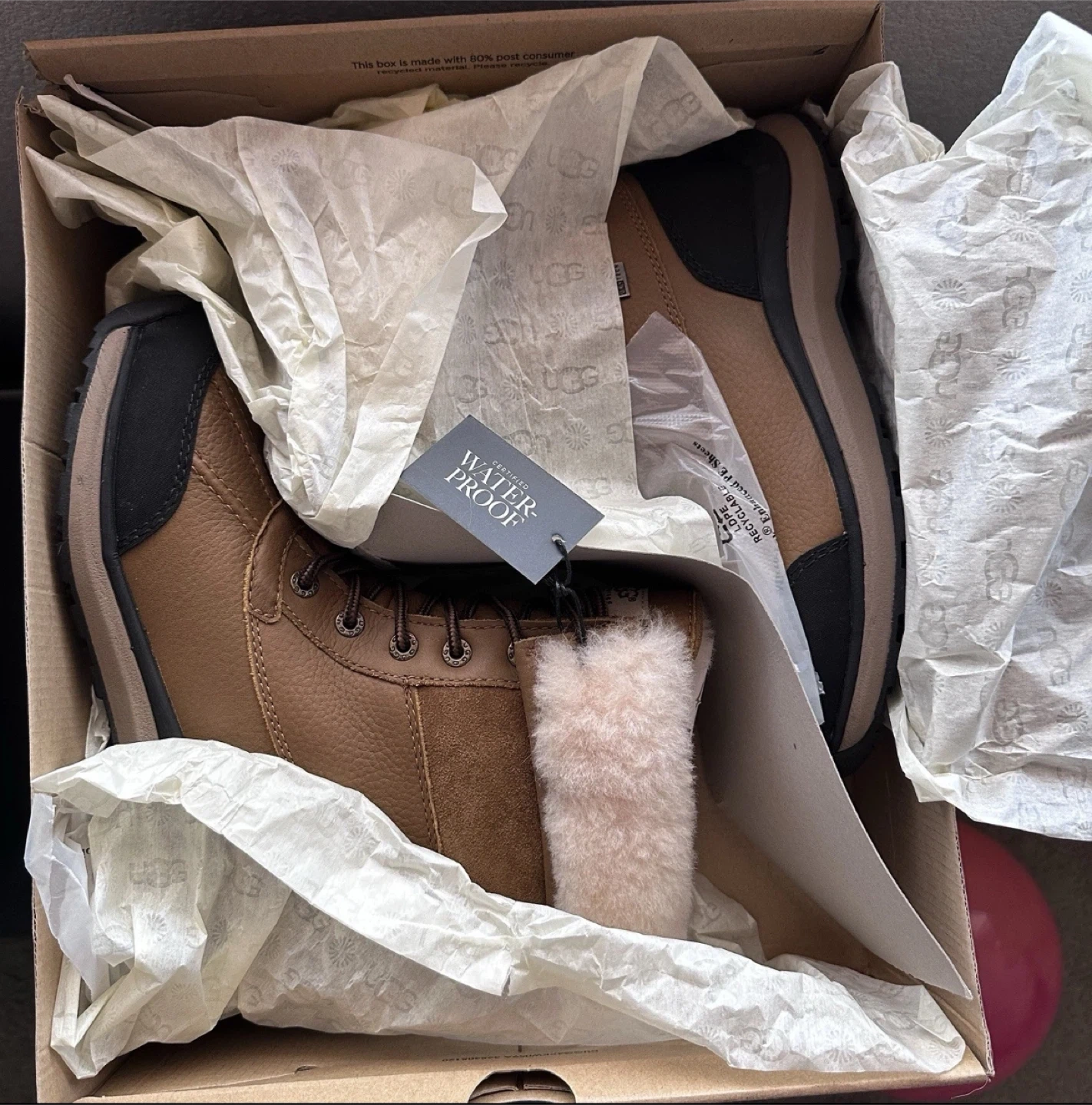 142These UGG boots are waterproof and feature a stylish leather upper with a cozy shearling trim. They are perfect for keeping your feet warm and dry in cold weather! The upper shaft and tongue and sock lining are 100% wool, and the lining backing is 100% polyester