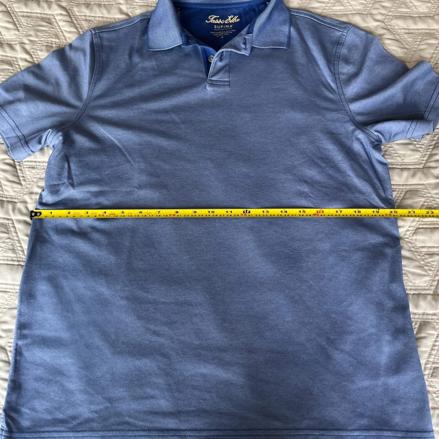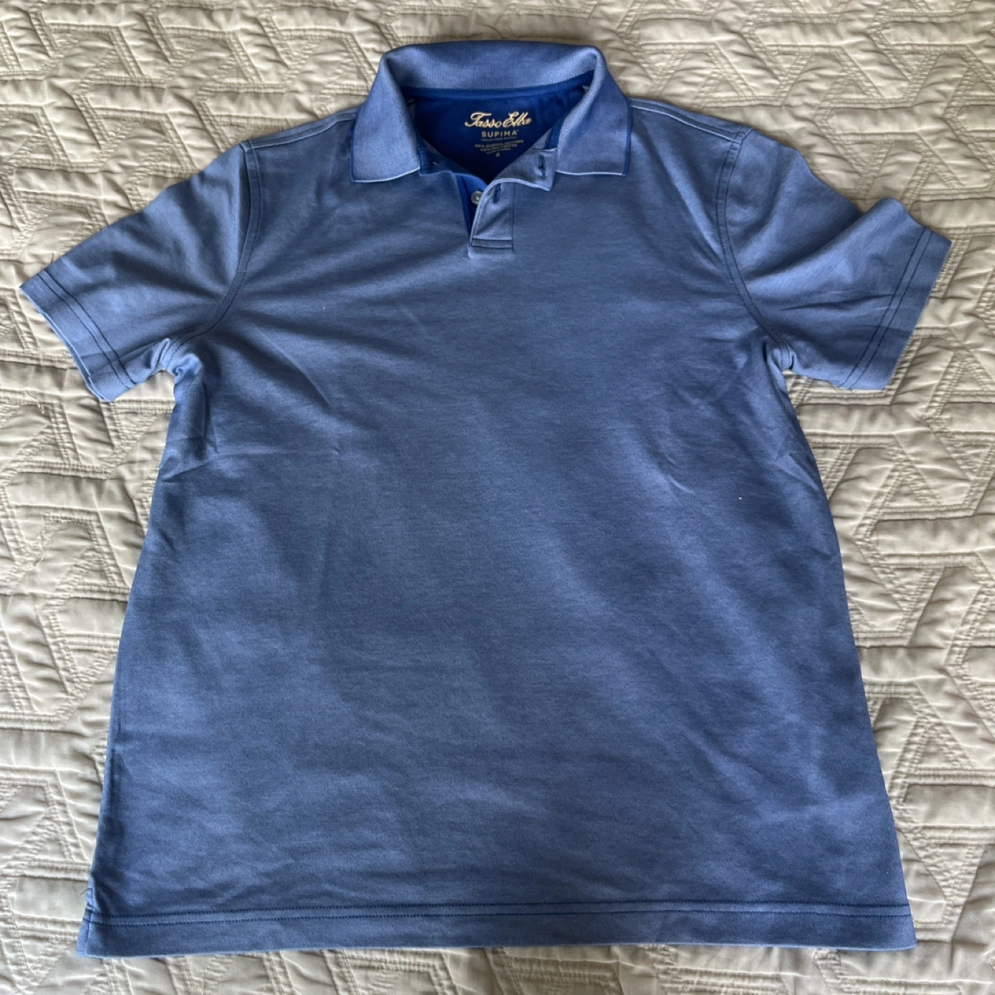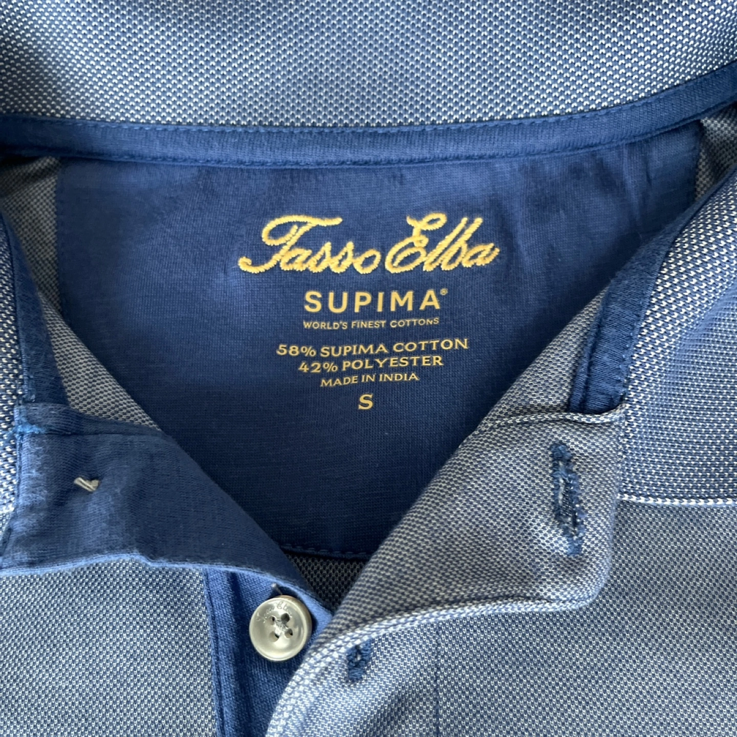 Short sleeve polo shirt. Size S can fit M . Made in India. Blue. 58% Supima cotton and 42% polyester.