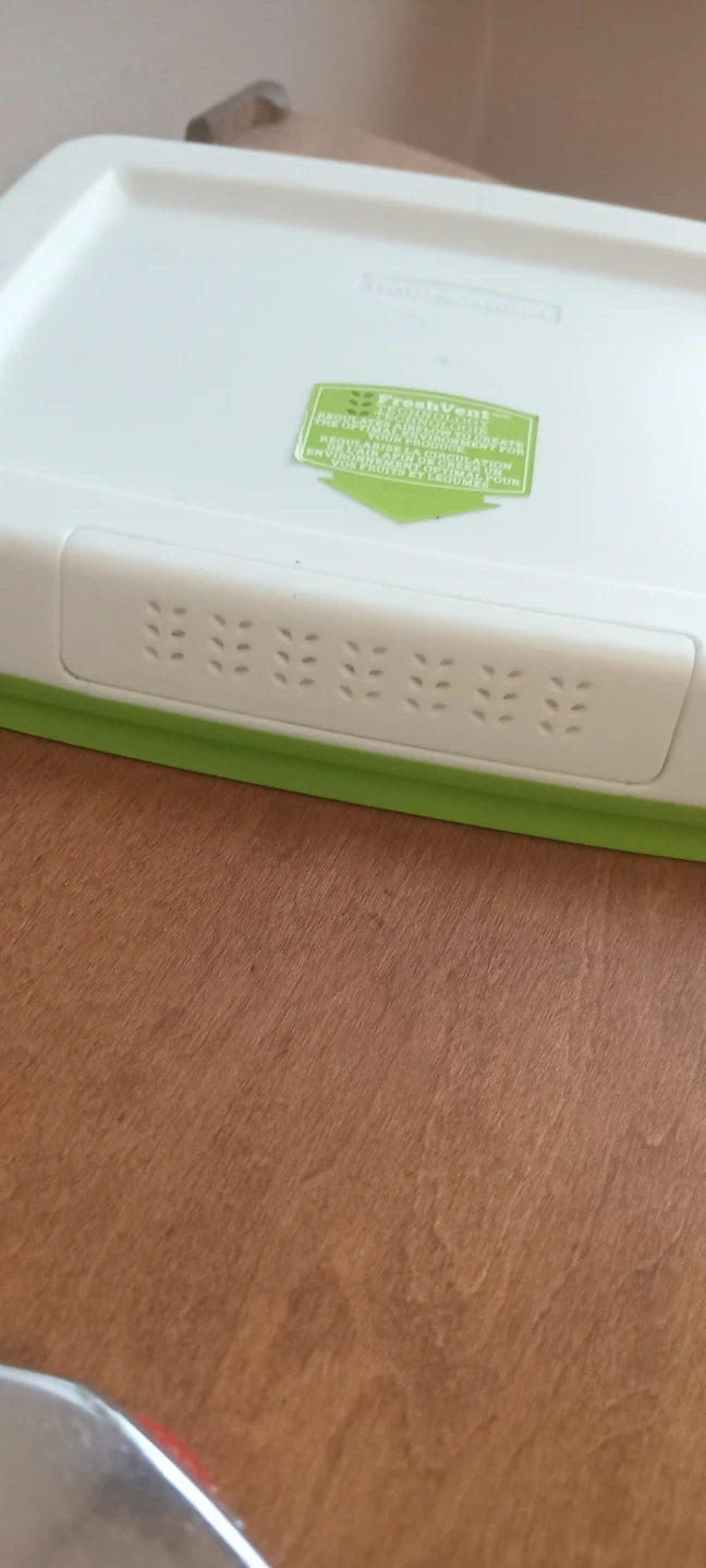 This storage container features FreshVent Technology to regulate airflow for optimal produce environments. It's designed to keep your fruits and vegetables fresher. It has a removable green insert.