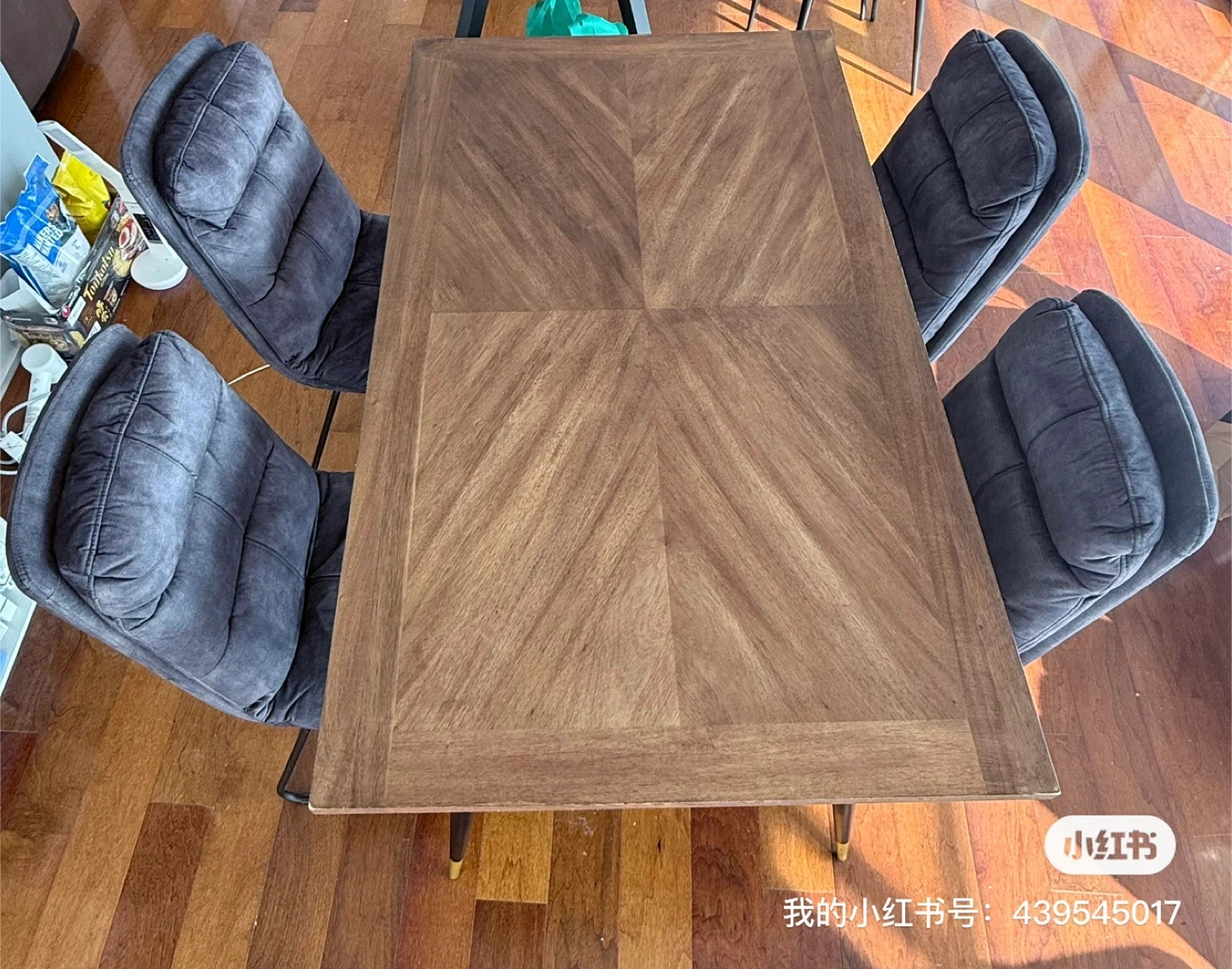 Selling one dining table set (1 solid wood table + 4 upholstered fabric chairs).