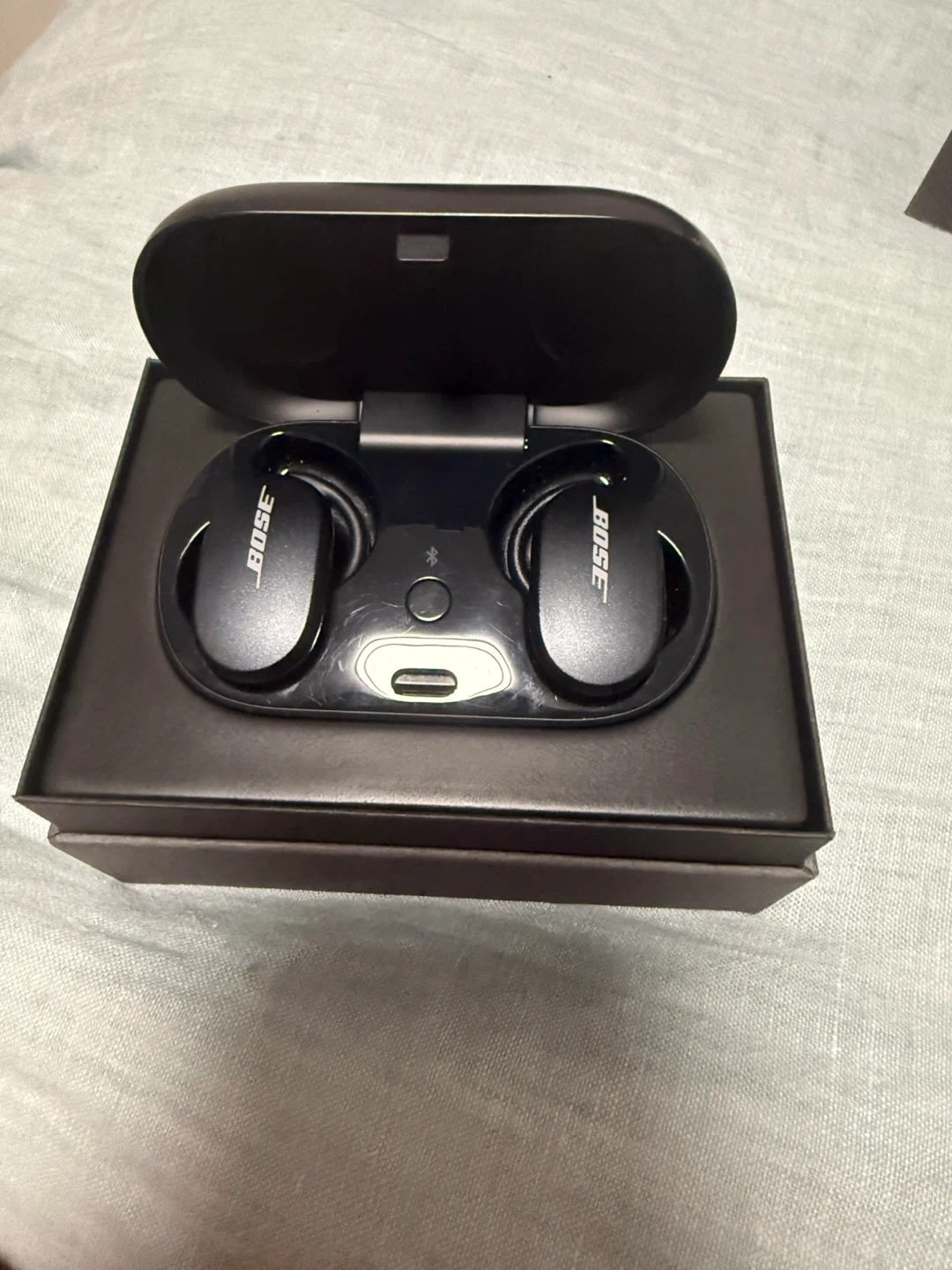 Black Bose wireless earbuds in a charging case. They're designed for active use. Includes the charging case and earbuds.