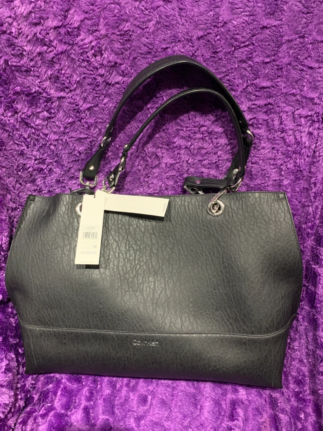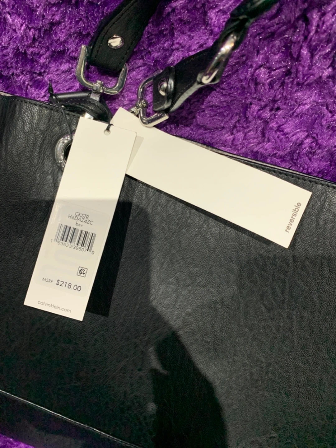 This Calvin Klein tote bag is black and reversible. It has a faux leather exterior with silver-tone hardware. The interior is grey.SRP $218