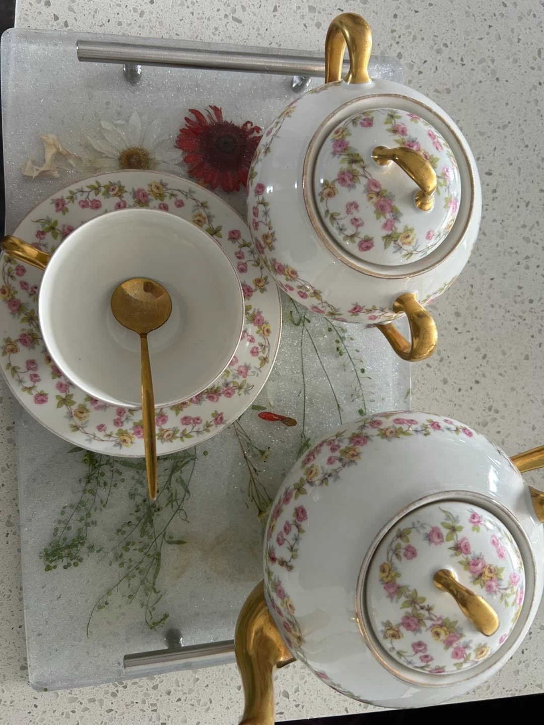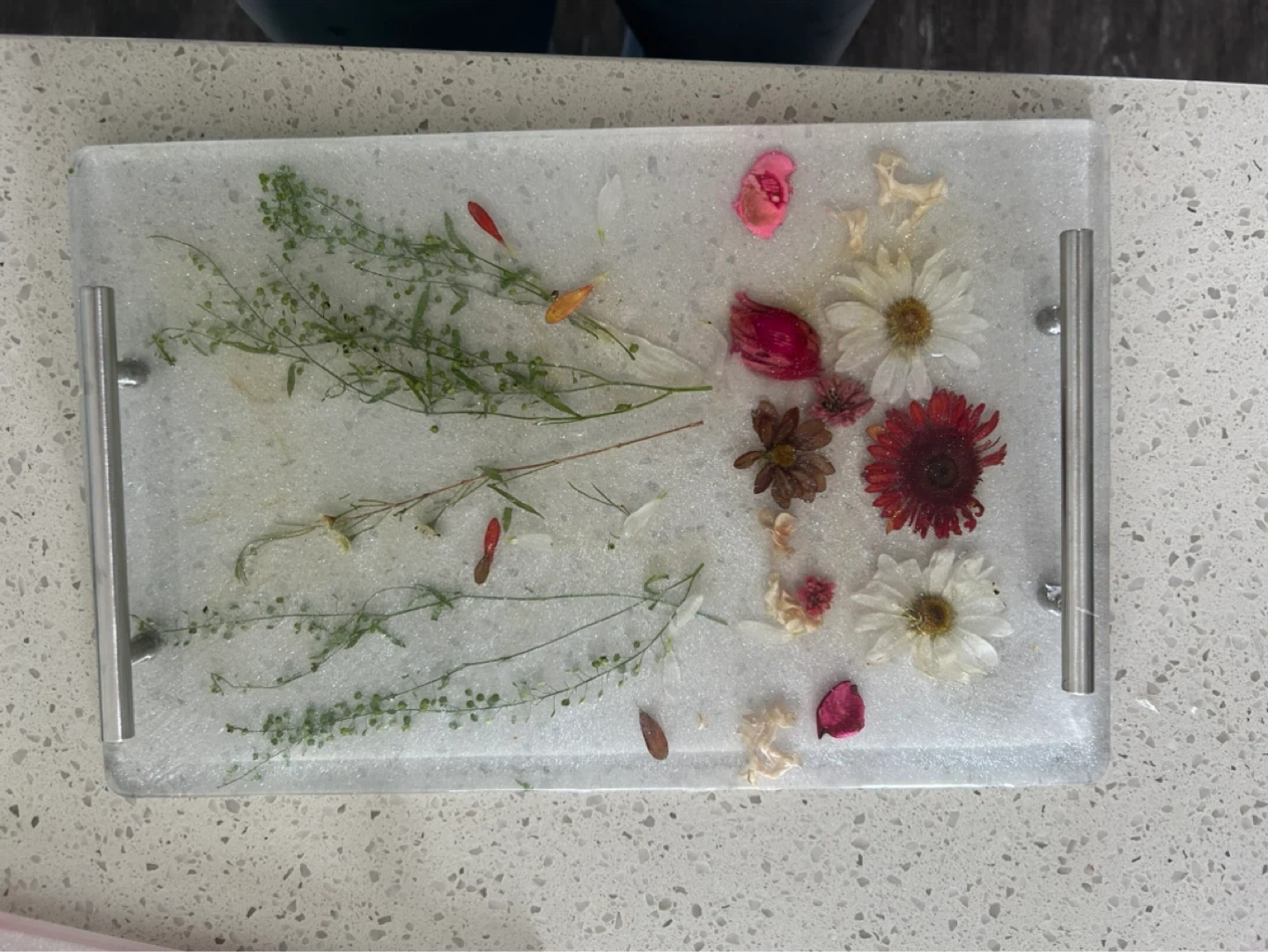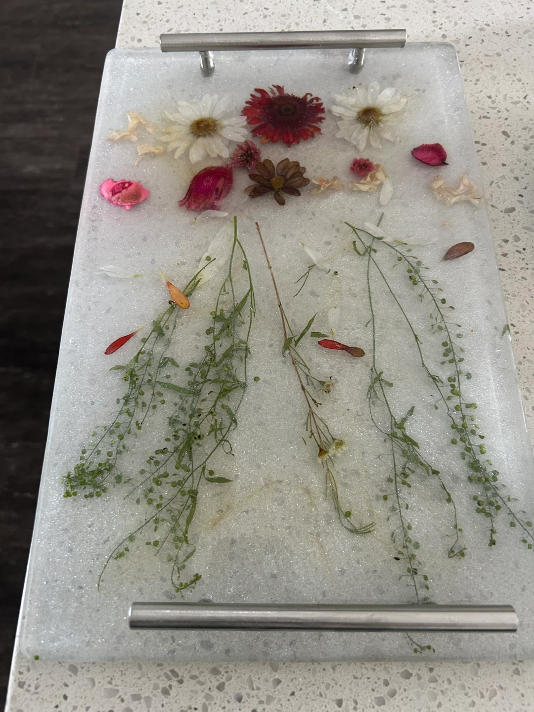 A beautiful resin serving tray embedded with dried flowers and greenery. It features two silver handles for easy carrying. Perfect for serving drinks or displaying decorative items. Handmade.