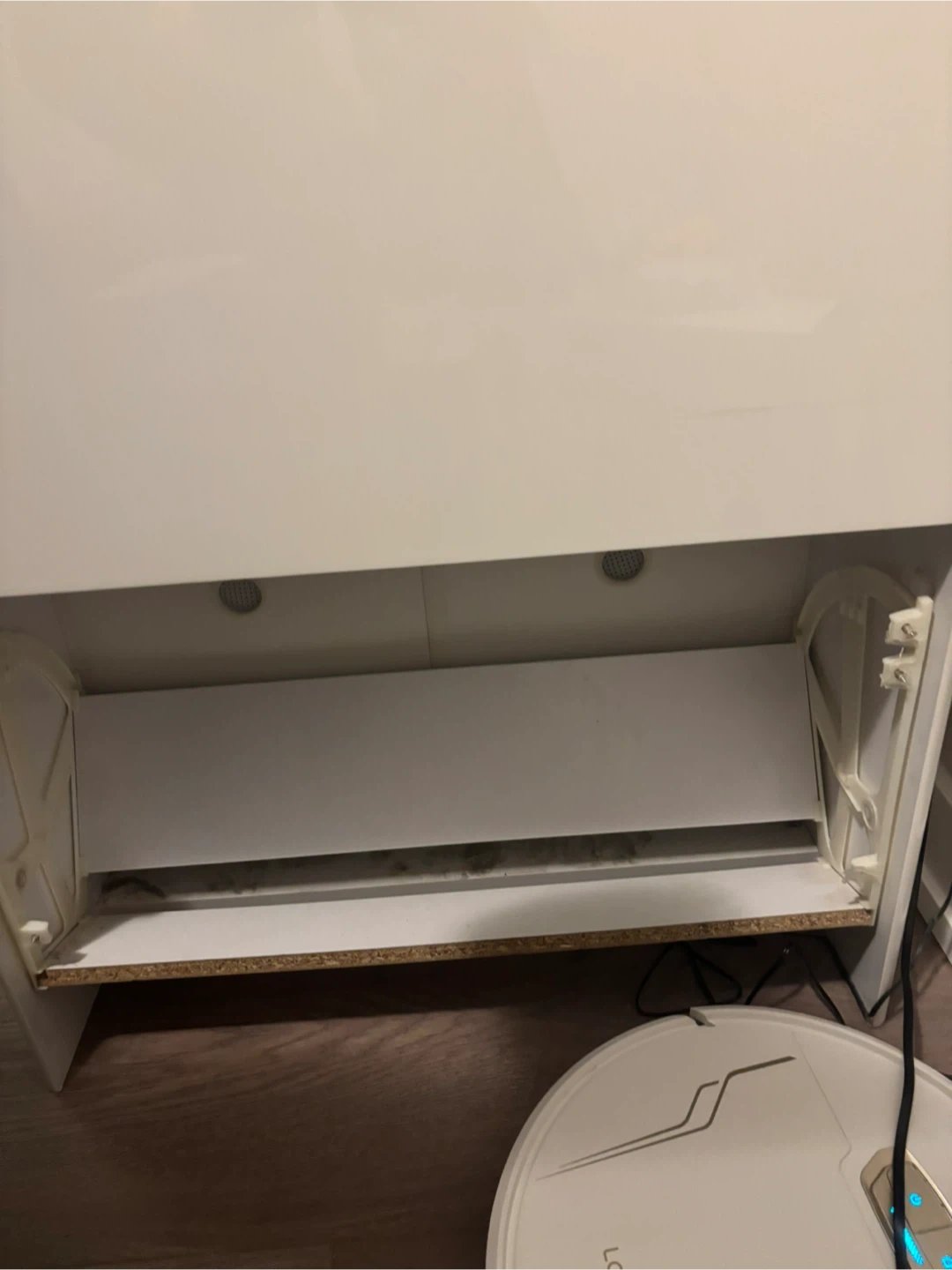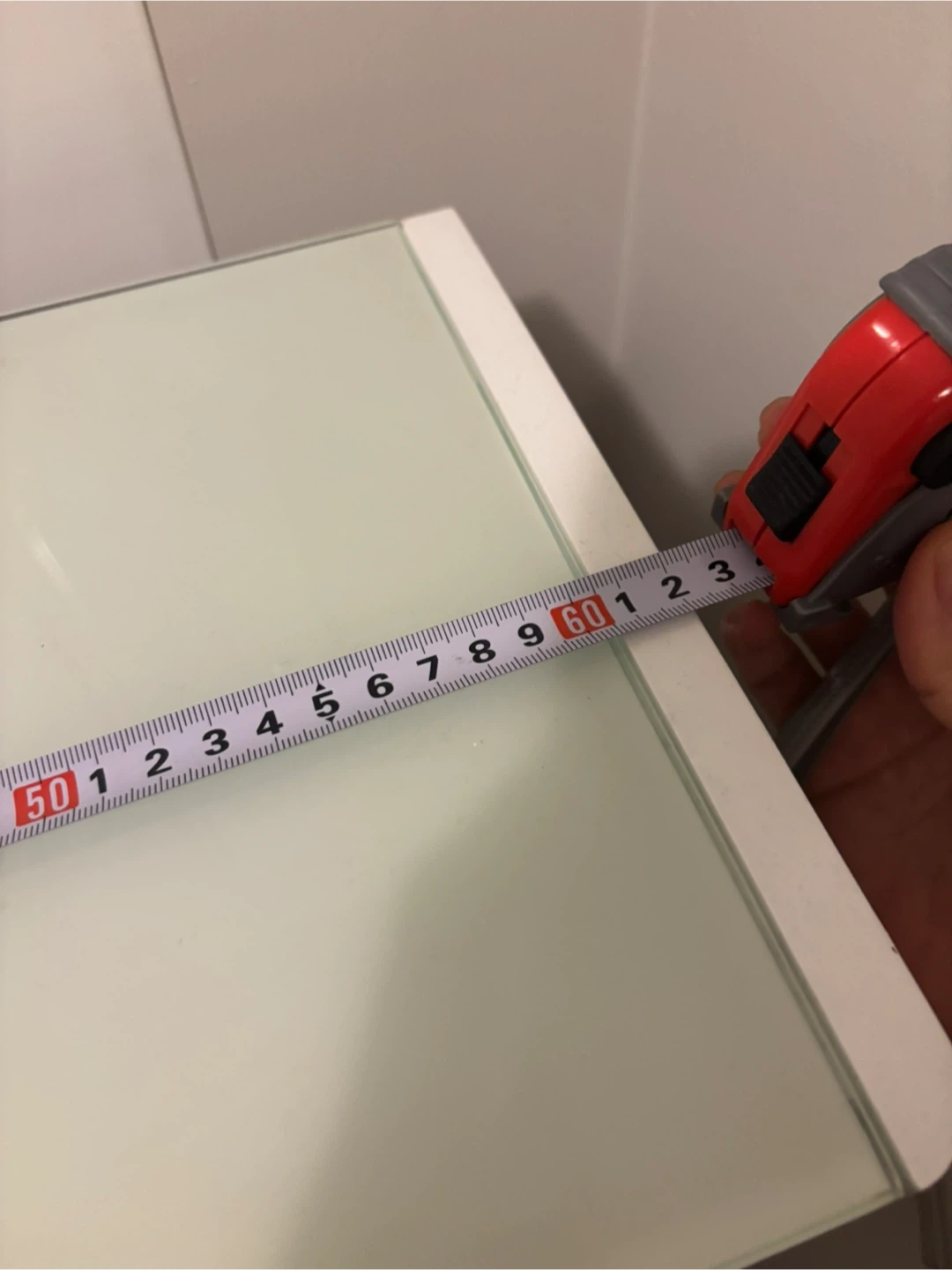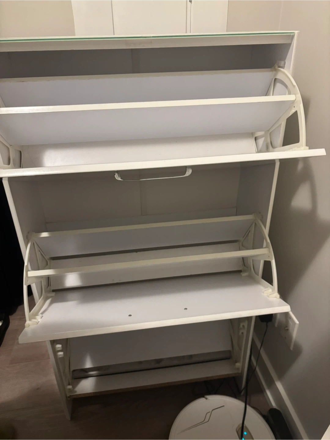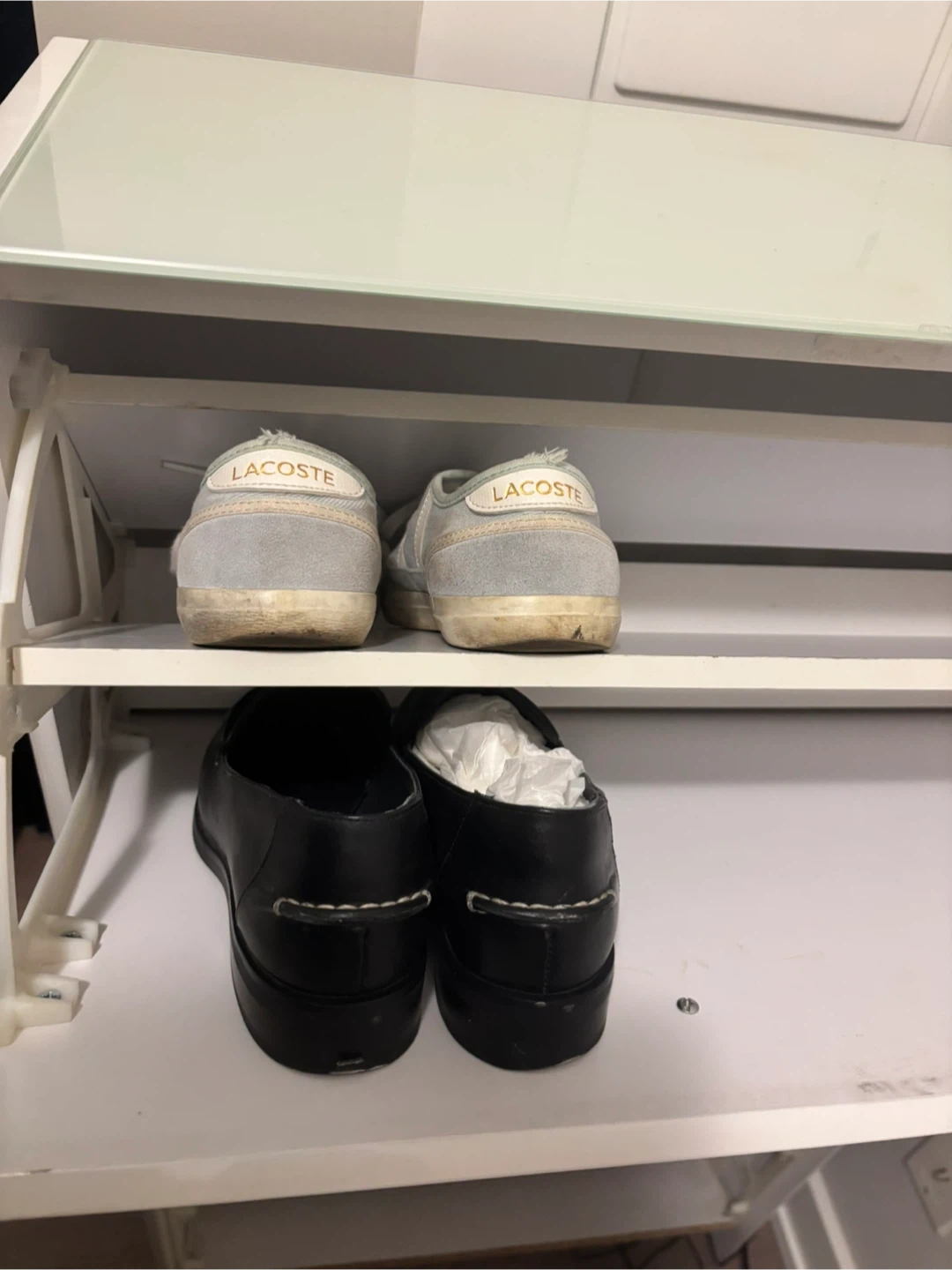 This white shoe cabinet has two tiers and a glass top.