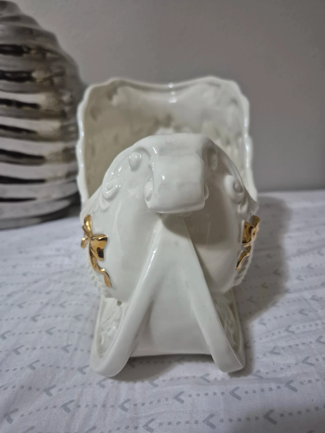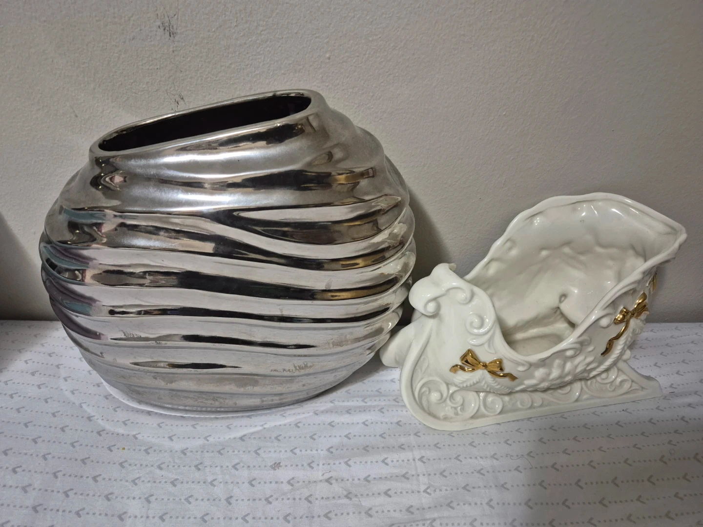 This ceramic sleigh dish is perfect for holding candies or small decorations. It's made of glossy white ceramic with gold accents. Adds a festive touch to your holiday decor! Also a metallic Grey vase with an asymmetrical opening.