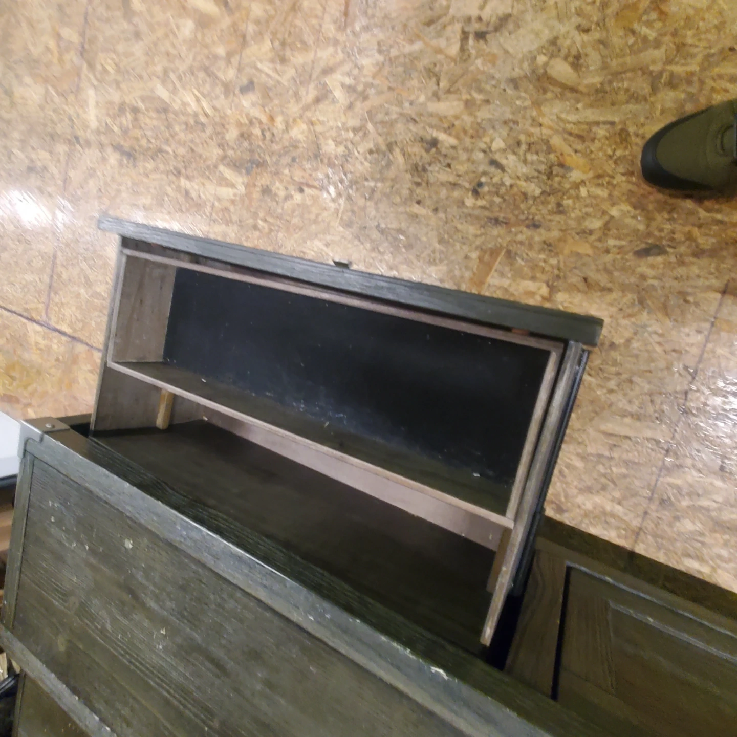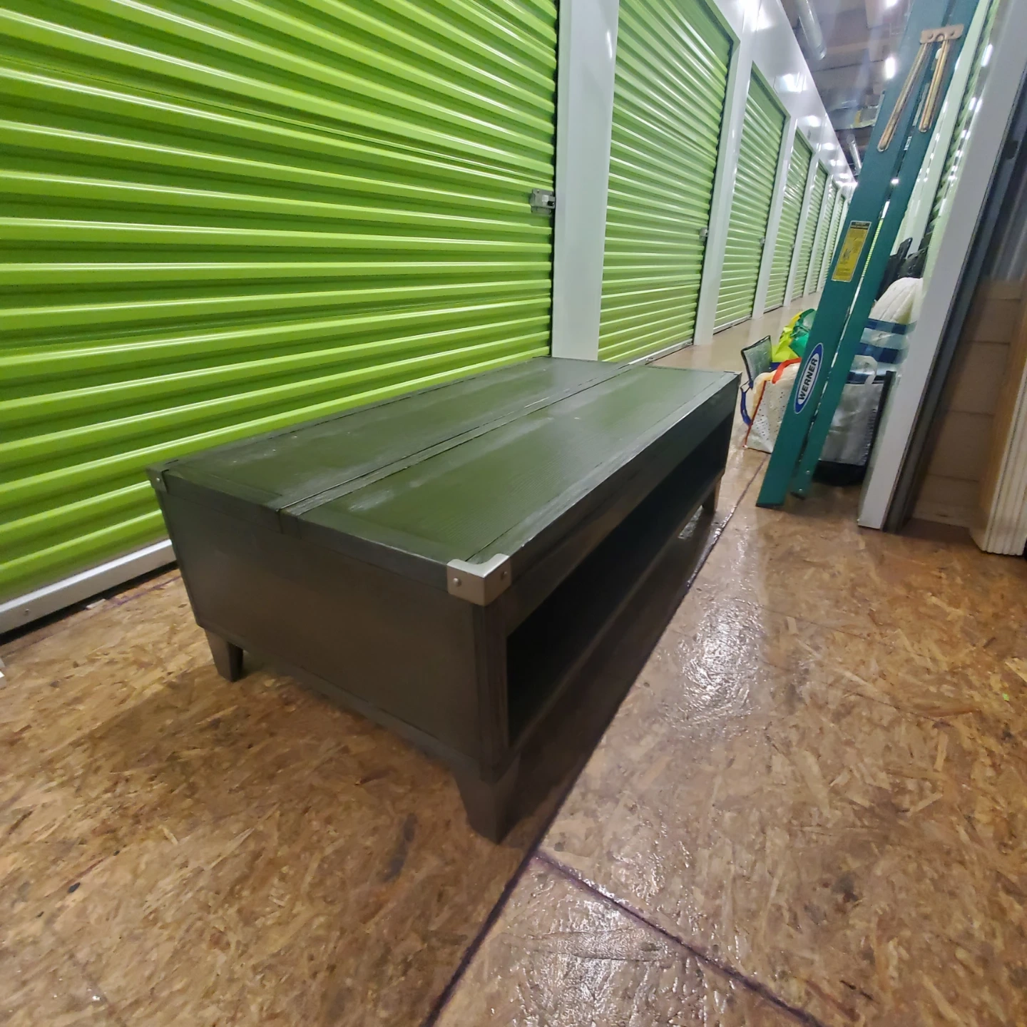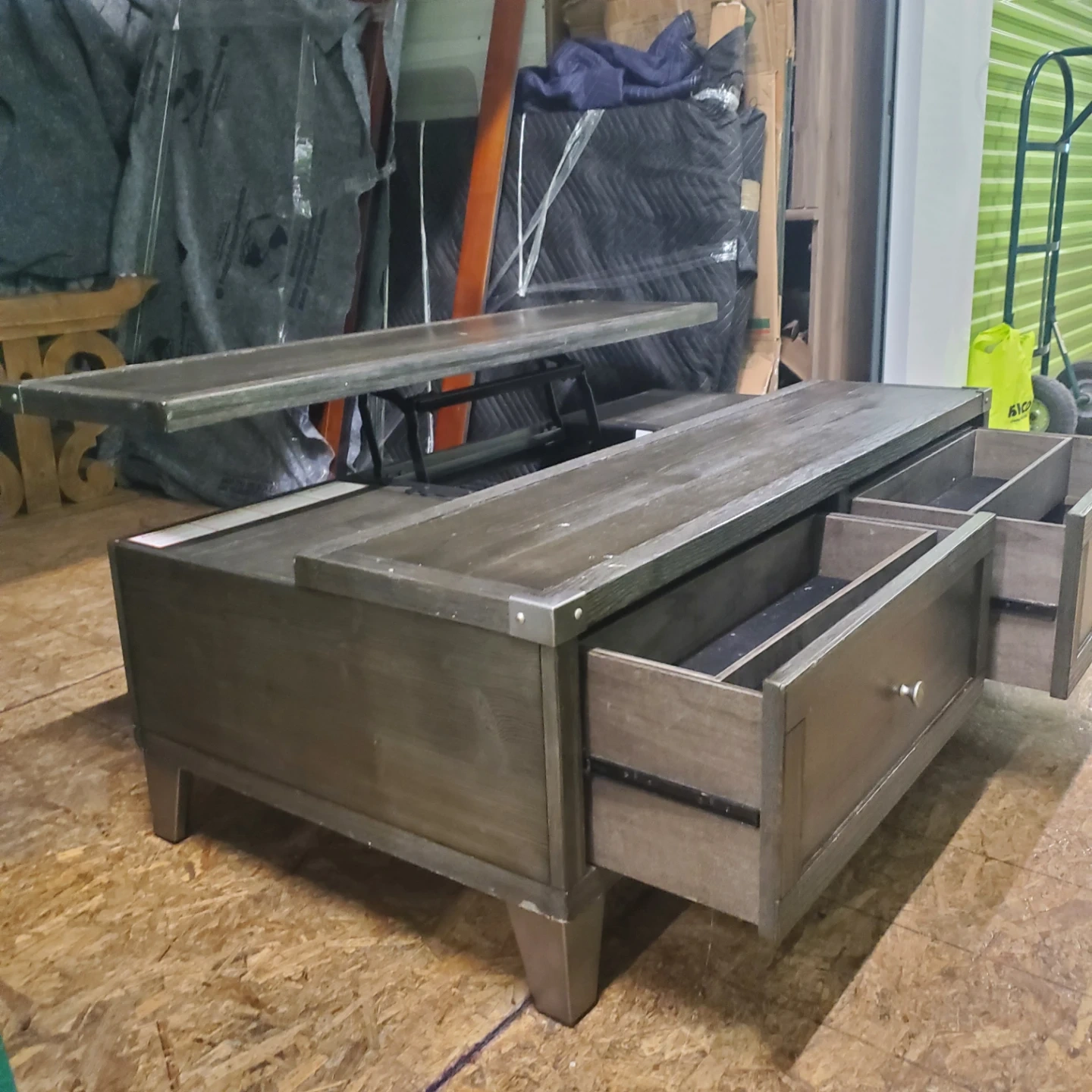 Grey lift top coffee table with two drawers. It features a lift-up mechanism for a raised surface. Wood construction with metal drawer slides.