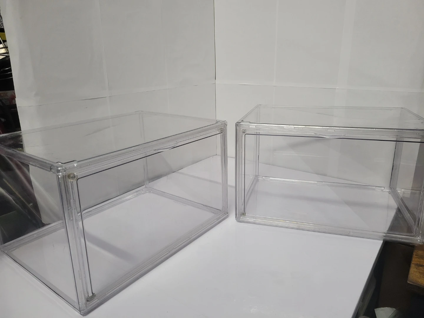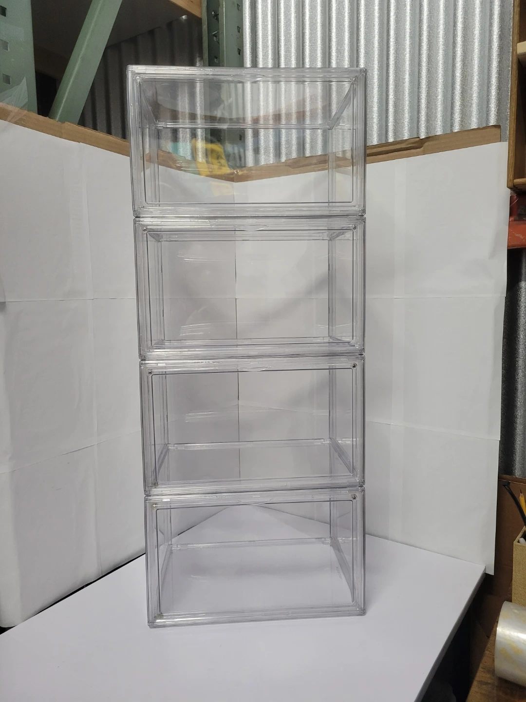 Set of 4 clear plastic stackable storage drawer boxes. These boxes are great for organizing various items. They're made of durable plastic and offer convenient access. Price for all 4.