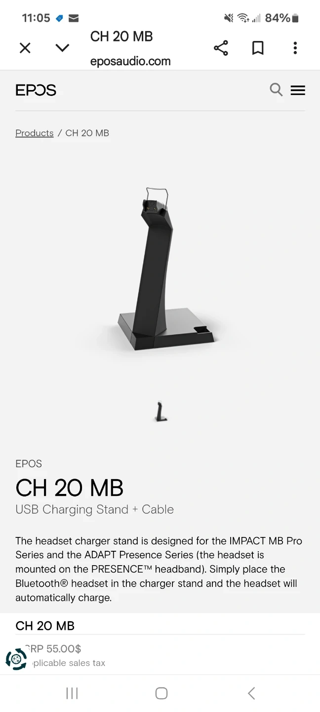 This is the EPOS CH 20 MB USB Charging Stand. It's designed for the IMPACT MB Pro Series and the ADAPT Presence Series. Simply place the Bluetooth headset in the charger stand, and it'll automatically charge.